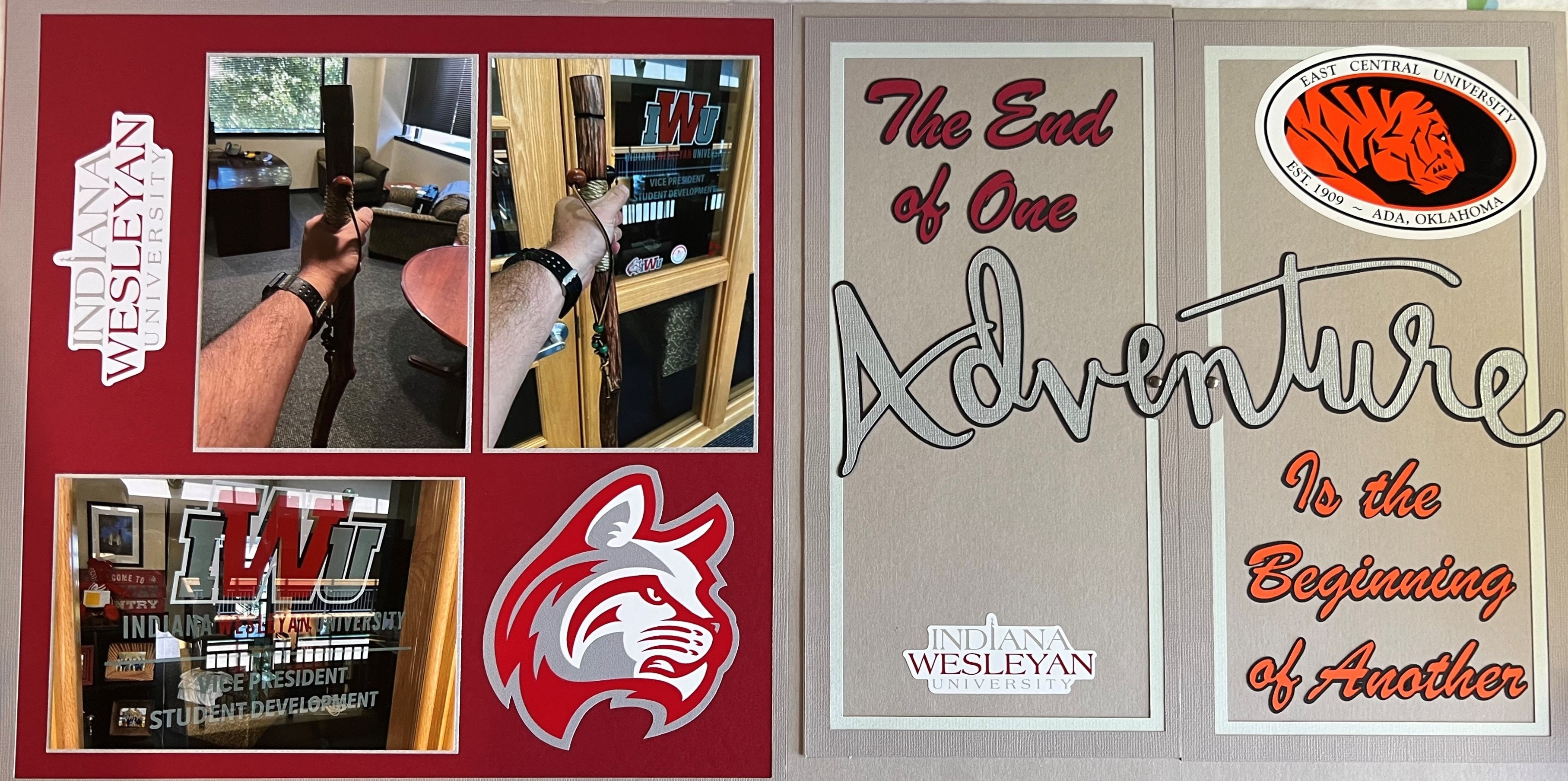 The righthand page is designed as a set of doors that open. On the lefthand door I put an institutional sticker and cut out the words “The End of One…” in red. The word “Adventure” then crosses over both doors, and the righthand door has the words “…Is the Beginning of Another” cut out in orange – the color of my new institution – East Central University. I cut out the doors and all of the letters using my Cricut Machine. I used my Crop-A-Dile Big Bite Punch to punch two holes in the edges to put brads through to serve as door handles for the pages. When you open the two sides of the page you see this: