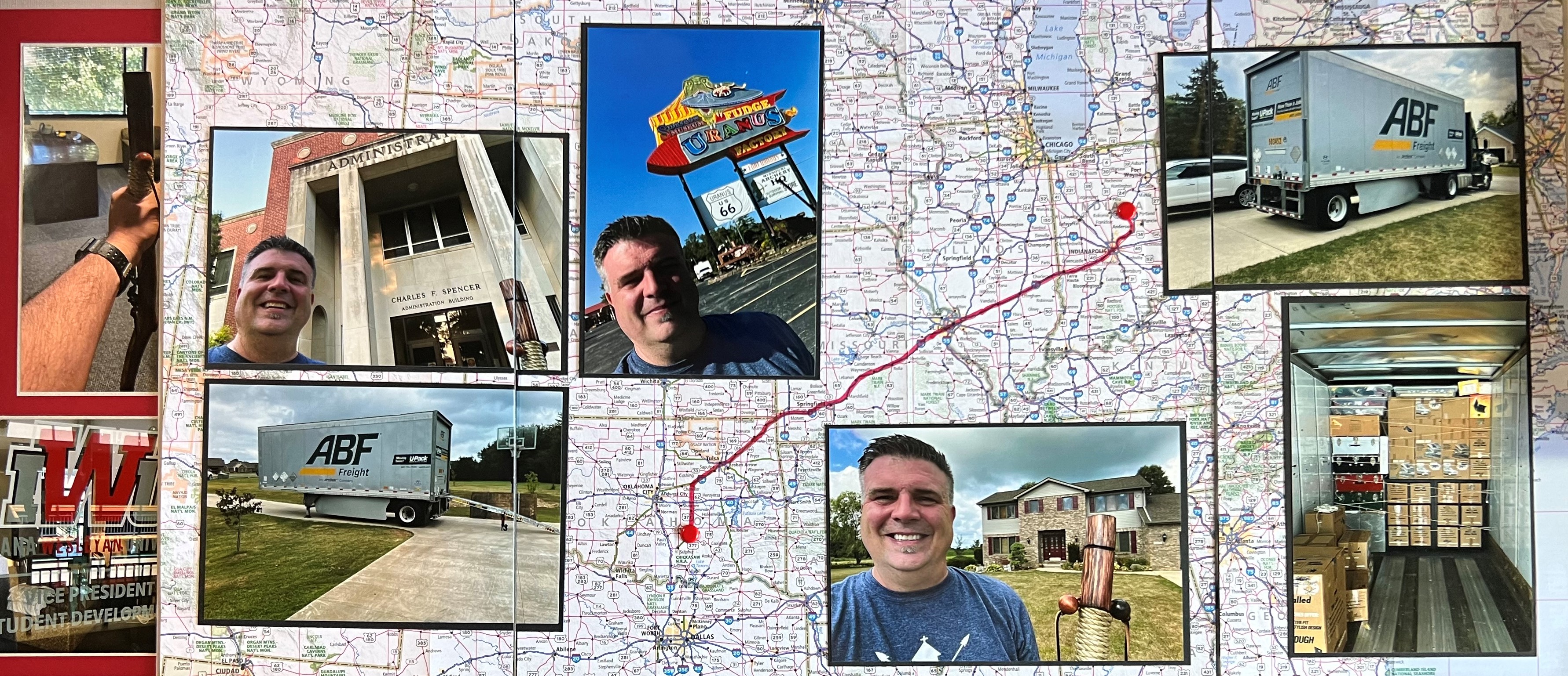 The photographs start on the right with the moving van at my old house in Indiana, move to the middle where I took a picture on the move at the Uranus Fudge Factory (That is a real place) , and end on the left with pictures at my new work, and the moving van being unloaded at my new house! Notice that you can see the walking stick in some of these pictures as well.