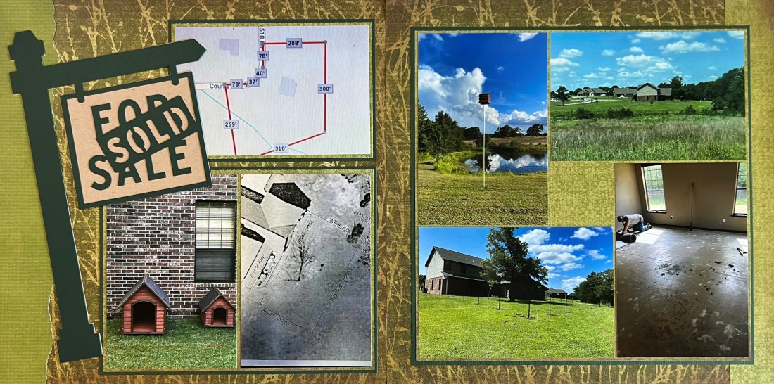 This spread celebrates the buying of the house and a couple of the projects that I worked on. The pictures on the lefthand page are the plot lines of our property, a google map image that I used to show a fence company where I wanted a fence installed and the two new dog houses that I bought for our dogs. I wanted our dogs to be able to spend more time outside at our new home and so we installed the fence before the pets came to join me. I chose a green theme for this spread as well to match the green in all of the photos. I used my Cricut Machine to cut out the “Sold” sign.