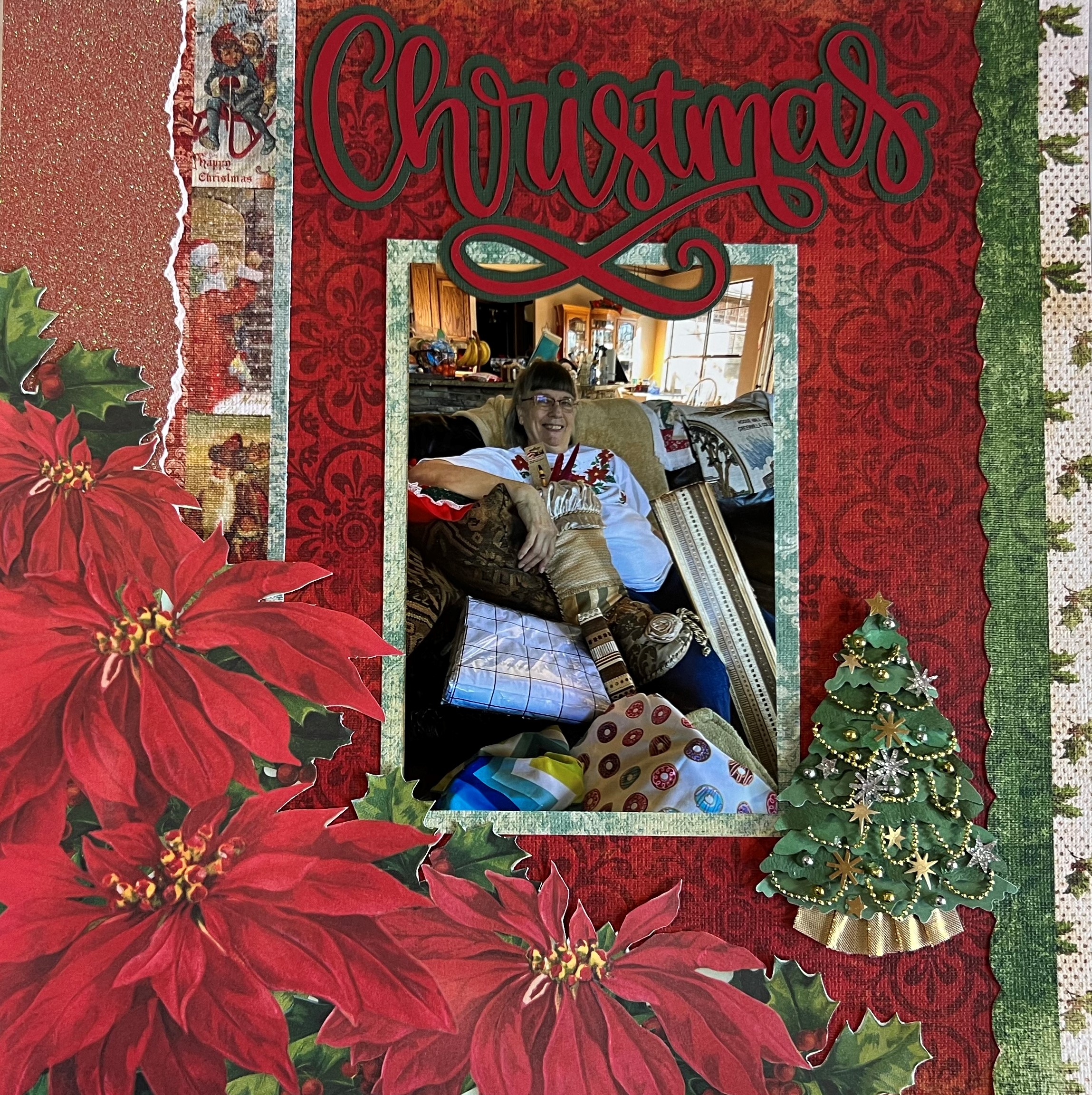 I chose a patterned red background paper for this spread and then used several layers of antique print borders to create a Victorian Scrapbook look for this page. I very carefully cut out the poinsettia design from a larger page using a pair of very sharp pointed scissors. This poinsettia design matches the design on my mother’s shirt as well. The Christmas tree on the page is a Jolee’s 3D sticker from a Christmas collection.