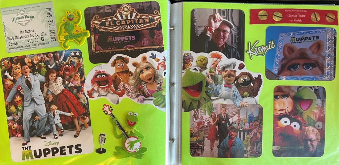 I had to choose Kermit green for this spread, as it features the frog himself! The lefthand page contains the movie ticket from the event which helps to place the date and time of the experience. I also put a picture I took from across the street of the marquee and the front page of the event brochure. I bought the plastic Kermit key chain in the gift shop and used a Jolee’s Kermit 3D sticker as an embellishment. I finished the page with a cutout of the Muppet cast taken from a brochure that I spread across both pages.