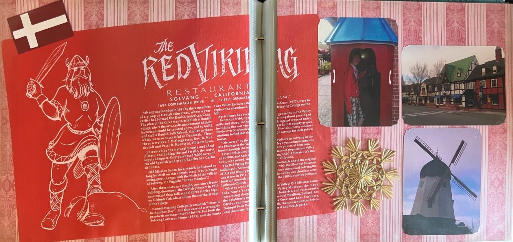 As we continued north during our post-Christmas 2011 Northern California trip we stopped in Solvang, CA, also known as Little Denmark. This is a wonderful town of Danish Heritage, and if you zoom in on the picture you can read the history of the town. Since so much in this town was red, that was the color scheme that I chose for this spread.
