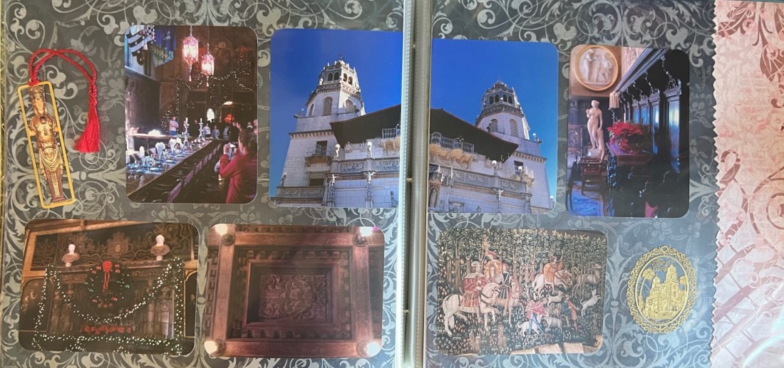 Page two of the Hearst Castle visit features a double picture from the front of the castle and interior pictures from the Dining Room. I chose a darker blue background for the spread, and then included a pink border on the right to bring out some of the pinks and whites in the photos.