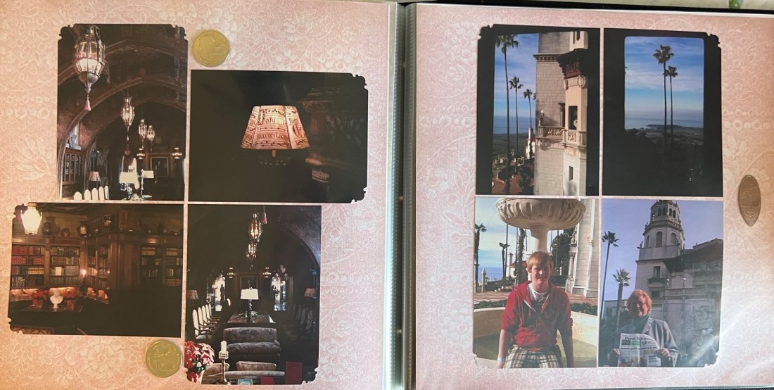 The lefthand page contains pictures from the Hearst Castle library which is intriguing and exotic. You can see a picture of a library lamp where the shade was made from medieval vellum from ancient books! This page also contains collectors’ coins from the museum gift store. These pictures were laid out in a pinwheel design and the exterior corners were embellished using a designed corner punch.