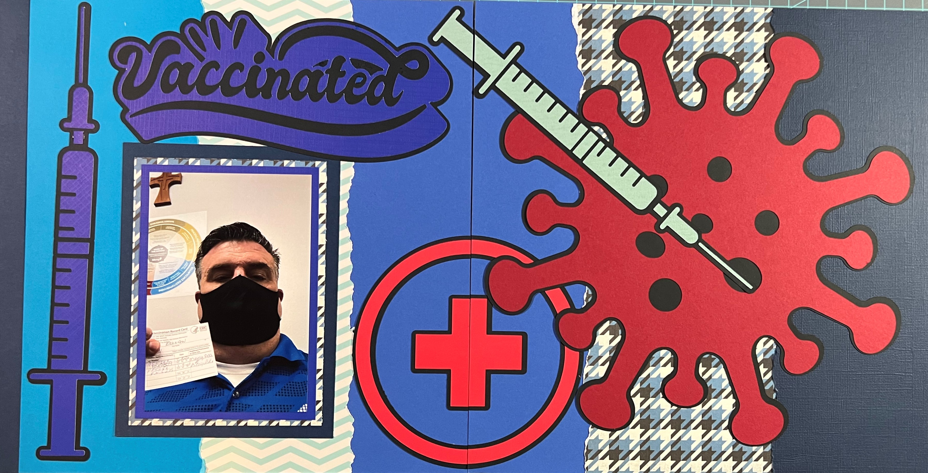 Since I had only one picture I wanted to fill the spread with images that would help to tell the story. All of the images, hospital symbol, syringes, COVID virus, and the title bar were on Cricut Design Studio, and were cut out using my Cricut machine. I used a double and triple wide border on the two pages to create more interest, and bordered the one picture with a triple mat using the same papers that are on the spread to help make it look bigger.