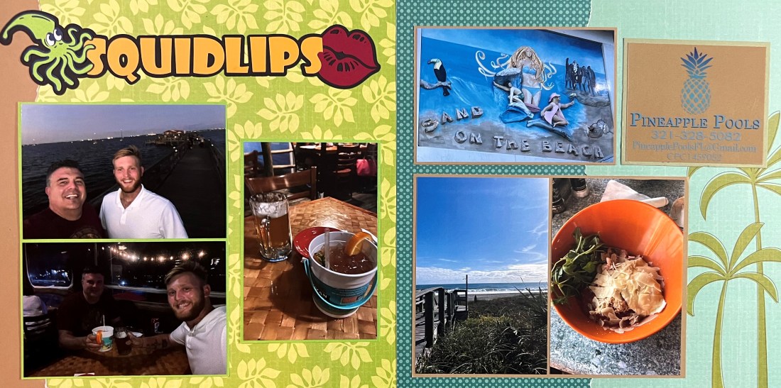I used beach vacation background pages for this spread. The left page is neon green to match the color of the squid in the title on this page, which I created using Cricut Design Studio and cut on my Cricut machine. I used images from Cricut Design studio and tried to closely mimic the logo from Squid Lips. I matted the photos with the same green cardstock as the squid was cut from. This is a really fun restaurant that can have quite a wait, but there are a lot of things to explore while you are waiting, and I found the food to be delicious.