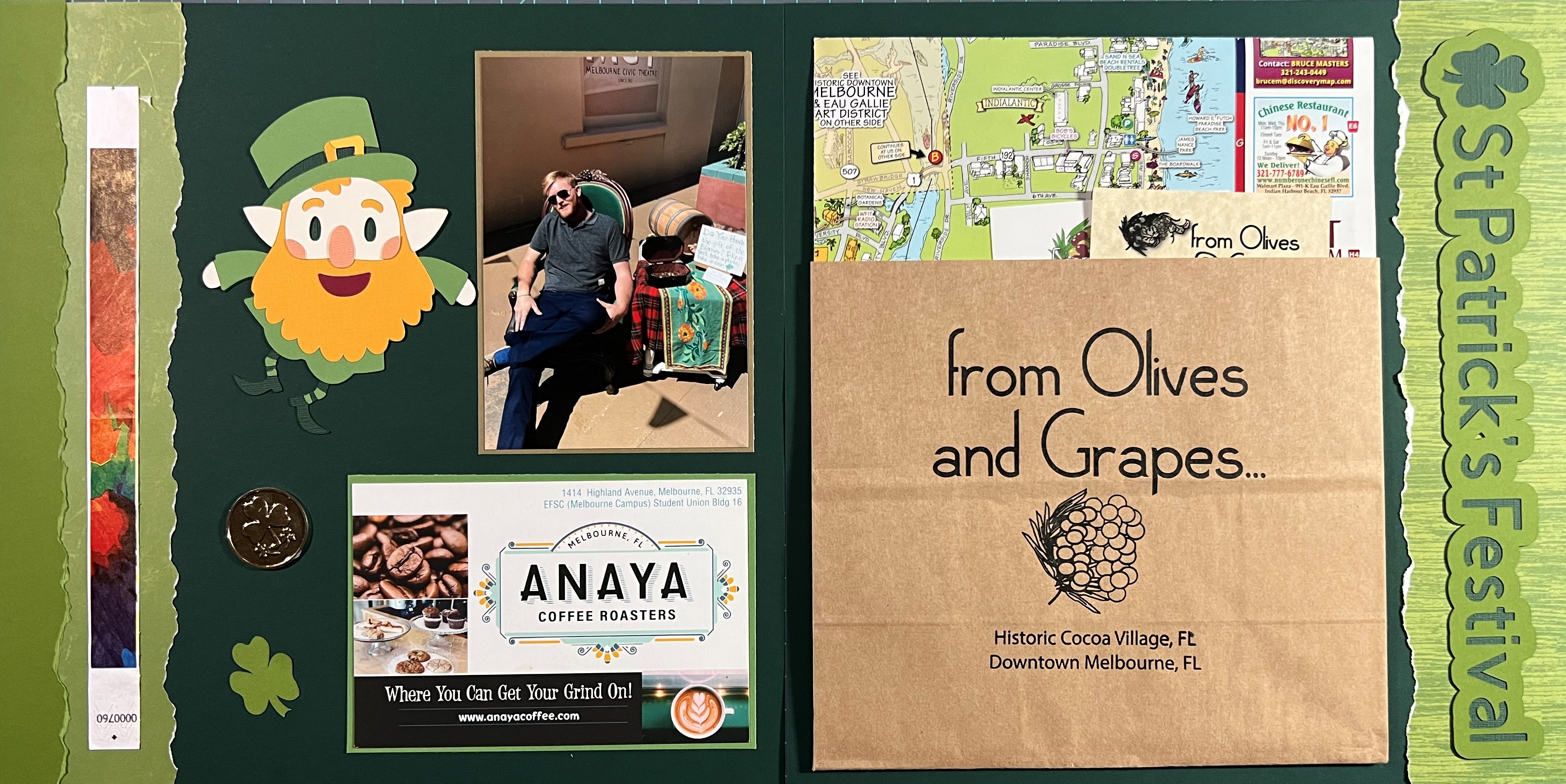 While on Spring Break 2021 we went to the Melbourne, Florida St. Patrick’s Day Festival. This spread uses just one photo from the event, but has a lot of ephemera. I did not do a great job of taking pictures at this event, mostly because I had bags I was holding from items I had bought as well as street food in my hands which made having my phone out difficult.