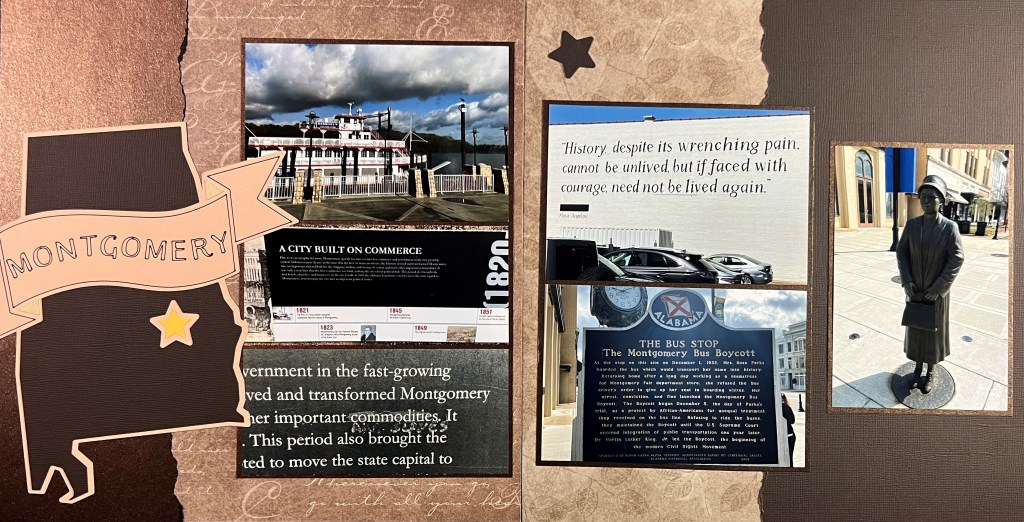 This spread starts the journey of my civil rights trip in Montgomery, Alabama. I used Cricut Design Space to download the graphic of the State and used my Cricut machine to cut it out. I used the pen feature to write out the banner as I felt that it would be too small to accurately handle the cuts. The pictures are bordered in either brown or copper, and I used a jagged edge tearing tool to create the wide borders on the spread. You will notice that the brown star on the right-hand page is the cutout from the map on the left-hand side.