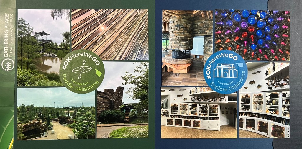 The right-hand page is themed in blue to match the TravelOK.com sticker in the middle of that page which represents museums. The pictures on this page are from indoor locations at the Gathering place and include pictures of some really cool collections of items. I used a jagged edge tearing tool to create the torn edge border on the right side.