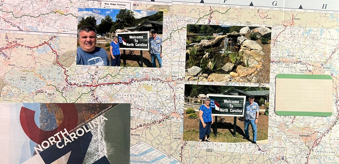 The third day of driving on our road trip got us to my sister’s house in North Carolina. This spread shows pictures from this part of your journey as we entered the state of North Carolina, and stopped at the Welcome Center, where I picked up this map which became the background for this spread. At the bottom of this page is a video that shows how I used the map to make the background.