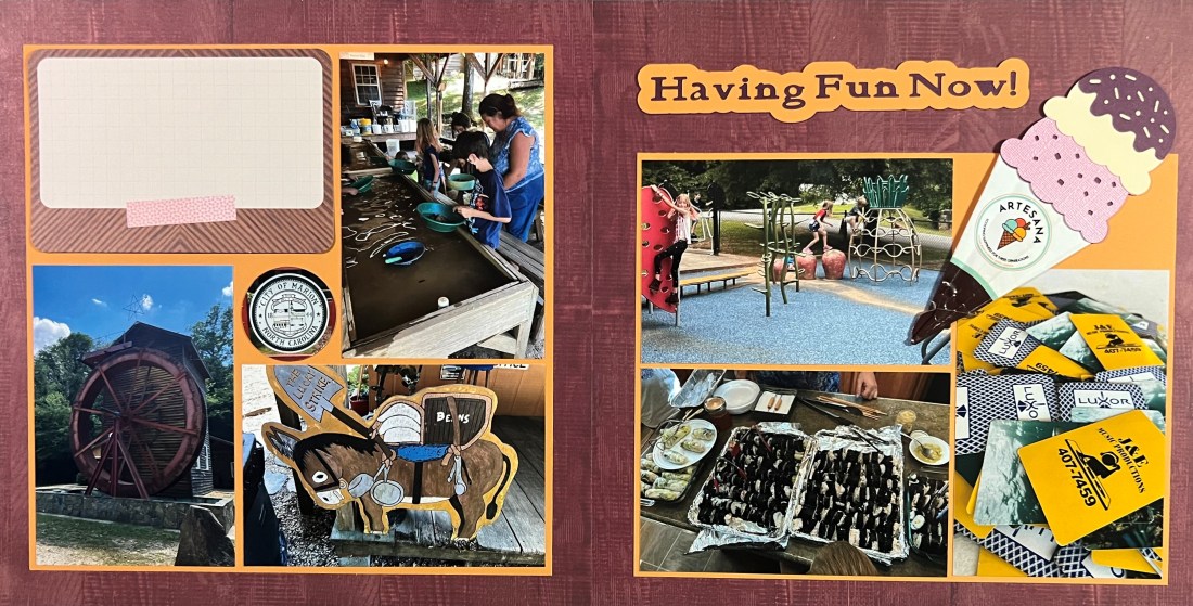 The right-hand page has pictures of playing at the “Food Park”, which until I got there, I thought was a bunch of food trucks. Needless to say, I was pretty disappointed, but the kids loved playing on all of the “food” items. Speaking of food, the bottom left picture on this page is of trays of sushi that my sister handmade for one of meals, and which was incredibly delicious. In the top right is an ice cream cone cover from Artesana, an ice cream shop in Marion, NC that has amazing ice cream. I carefully preserved the cover, and then used my Cricut machine to create “scoops of ice cream” to put on top. Below the ice cream cone is a picture of playing cards, as most of the time that we were at home we were playing various card games with the kids.