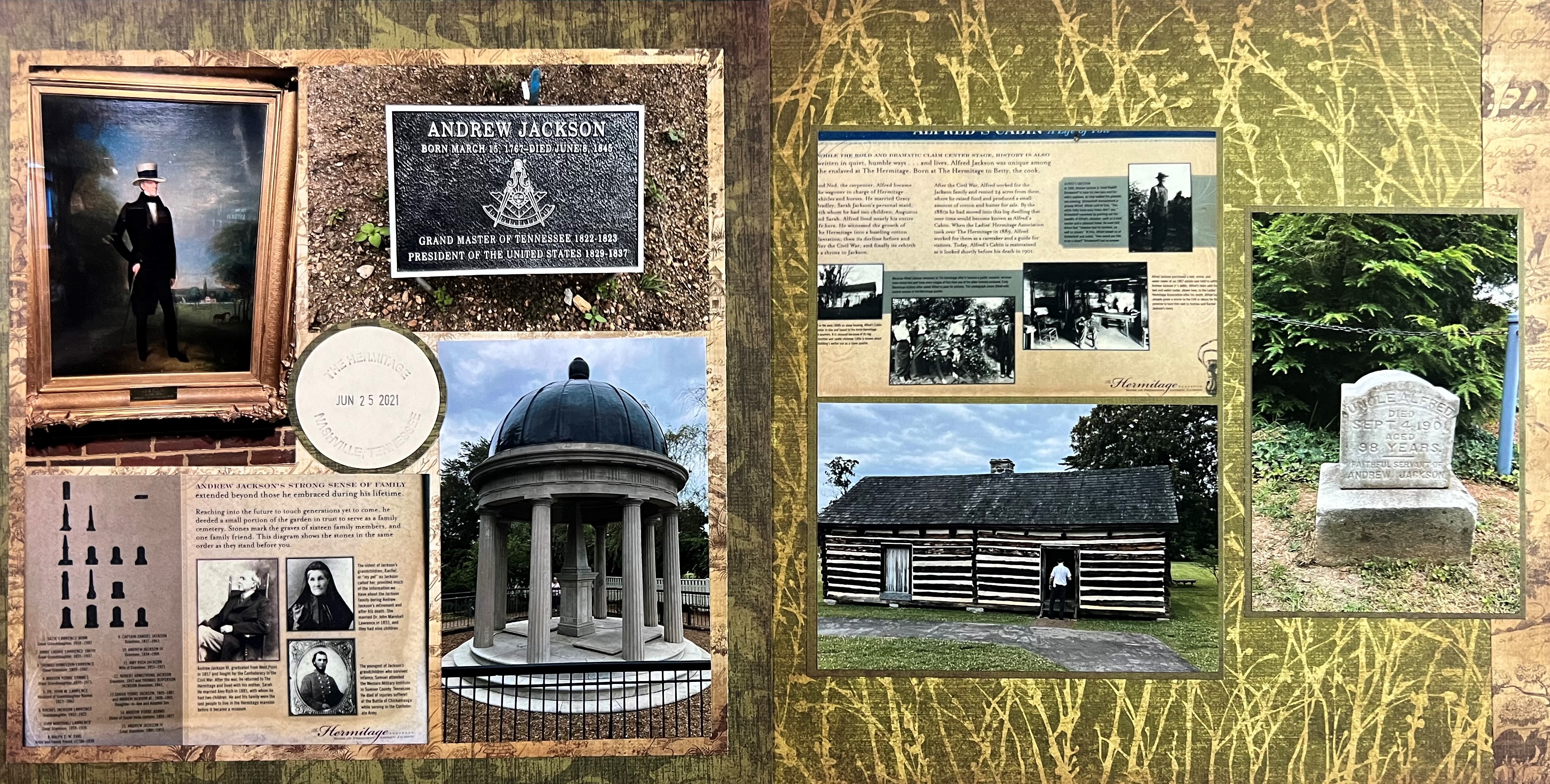 This is the second spread of our visit to the Andrew Jackson Hermitage. This spread is a little more somber as it shows the Jackson family cemetery and shares the story of one of their slaves. I picked brown and green background papers and matting for this spread to match the colors in the photographs.