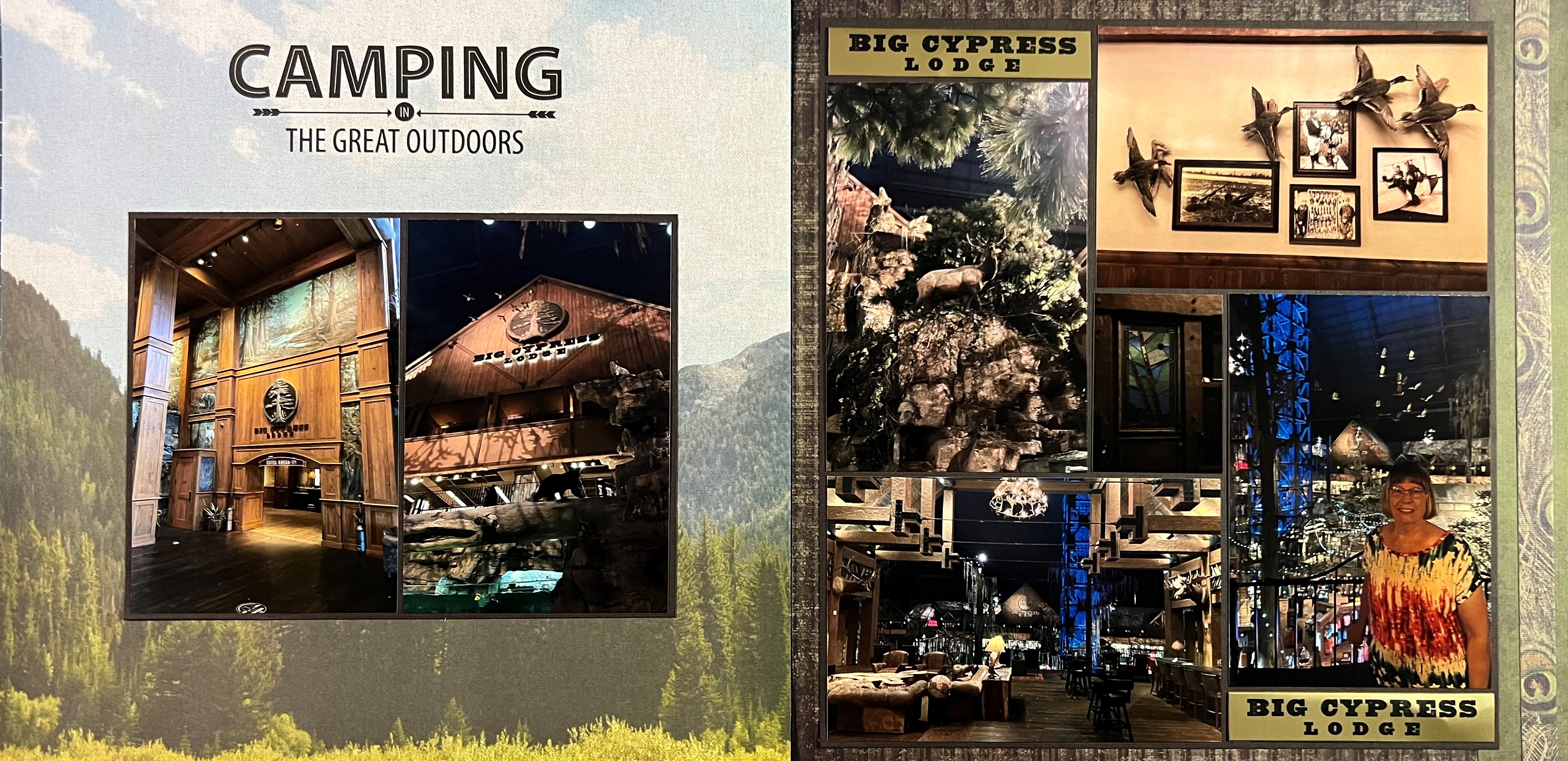 This is the second scrapbook spread from our stay at the Big Cypress Lodge in the Bass Pro Shop at the Pyramid in Memphis, TN, and features pictures from inside the pyramid and inside the Lodge. I used background cardstock from an outdoor pack and got a little kick out of the title on the left-hand page – “Camping”. The left-hand page shares a picture of the entrance to the Lodge check-in area, as well as a picture of our balcony from the floor of the Bass Pro Shop inside the Pyramid. If you ever have opportunity to stay here, I recommend the experience. I will share though that you must plan far in advance as the rooms book early. I would also encourage you to pay more to get an inside room with a balcony overlooking the store floor as you can enjoy seeing this incredible interior all night long if you wish, even after the store is closed.