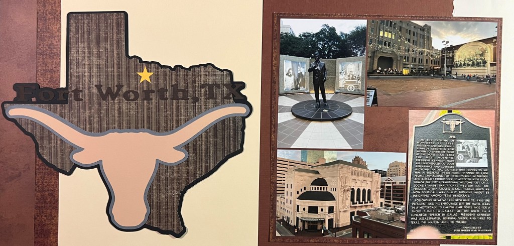 The left-hand page shows a title page that I made using Cricut Design Space and cut out using my Cricut machine. The right-hand page contains photos from our walking adventure through downtown Fort-Worth including a JFK memorial and historical marker outside of the Hilton Fort Worth (where JFK spent his last night), Bass Performance Hall, and the Sundance Square. I chose various shades of brown for the color scheme to match the colors that are in the photos.