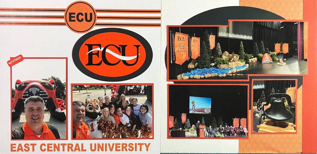 For the left-hand page I used some cardstock that I purchased at our local scrapbook store. For a town our size I was surprised that we had one, and immediately bought a copy of everything that they had in East Central University themes. I added two selfies that I took on opening day which I bordered in Orange (one of our school colors) and added the ECU bumper sticker to the mix. The #ECUTIGERS sticker which is on the page was actually from a keyboard sticker set.