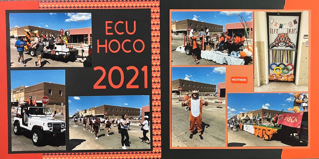 I am currently working at East Central University, and Homecoming 2021 was the first homecoming that we had after Covid. We revived ECU Homecoming traditions and restarted the ECU Homecoming parade. I chose orange and black for the theme of this spread to match the institutions colors.