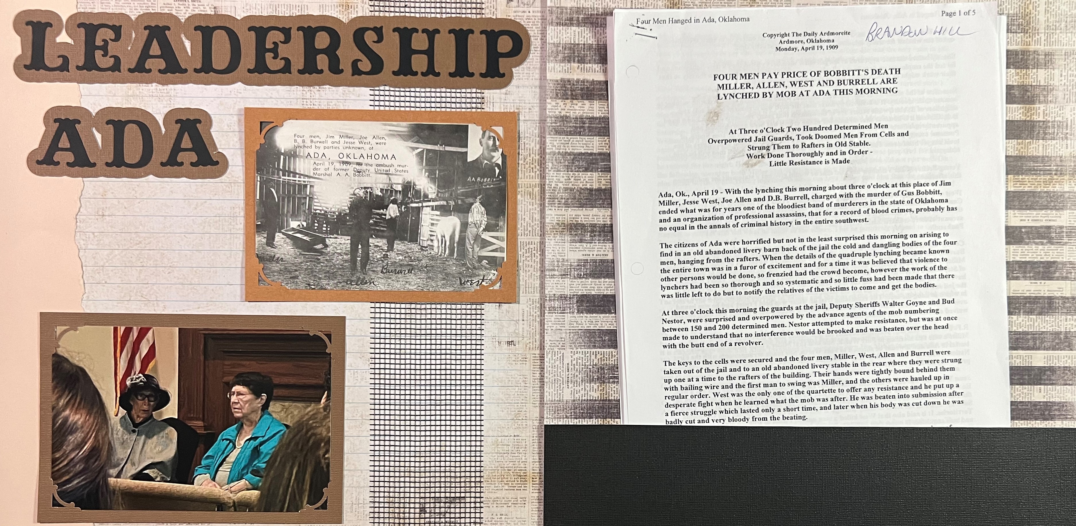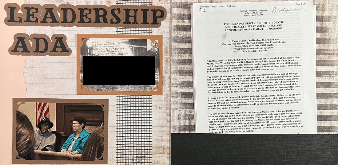 One of the initial days was learning about the history of Ada through learning from elders and taking some walking and bus tours. This page contains a picture of local historians, and a pocket to hold the historical reading materials that were shared with us. One of the historical pivot points of Ada, Oklahoma, is the lynching of four men that were involved in the murder of a local sheriff. Details of this event are covered by this Ada News Article. The postcard of the lynching on the left-hand page was given to us by the historians, and I attached it to this page using a corner punched mat, so that I would not have to put adhesive tabs directly onto the back of the postcard. I created duplicate matting for the photograph as well to tie the two together.
