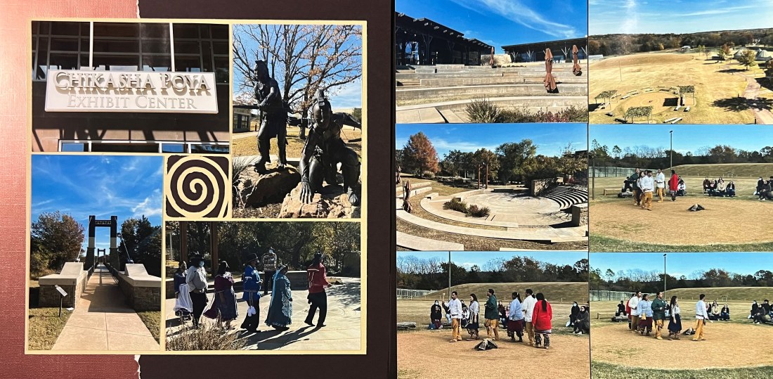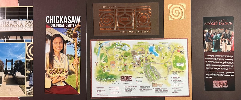 In the Fall of 2021, my parents and I went to visit the Chickasaw Cultural Center in Sulphur, Oklahoma. We wanted to be more aware of the history of the people on whose lands we are currently living and had been told that this was one of the best ways to do that. For this spread I used a Swinging Shutter Plastic Page Protector which impacts the design of the pages. At the bottom of this post are two videos I made of how these pages work.