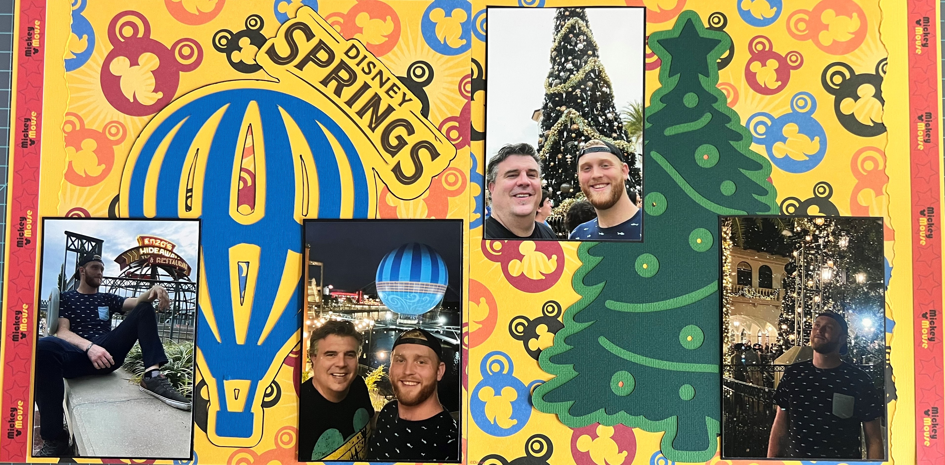 I used Cricut Design Space to create the Title block from the Disney Springs logo, which I found online, and the balloon – and used the outline feature to blend them together. This graphic, along with the Christmas tree were then cut on my Cricut machine. The balloon was cut in blue to match the color of the Aerophile in the photograph which we took from the balcony of the restaurant where we were enjoying dinner.