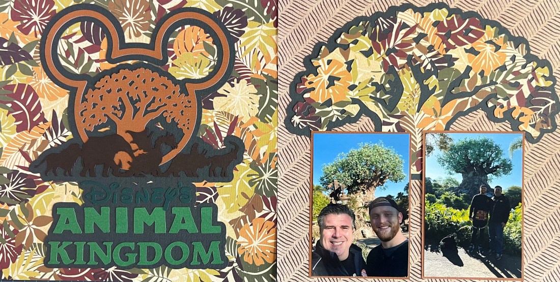 I purchased the graphic on the left-hand page on Etsy and used my Cricut to cut it out using colors that complimented the background papers which came from a Safari cardstock pack. The tree on the right side was cut using my Cricut machine from the same background paper as is used on the left-hand side. The contour border for both graphics is the same dark green to help tie the two pages together. In the next few days, you will see the leftover cutouts from these graphics show up on some of the other pages.