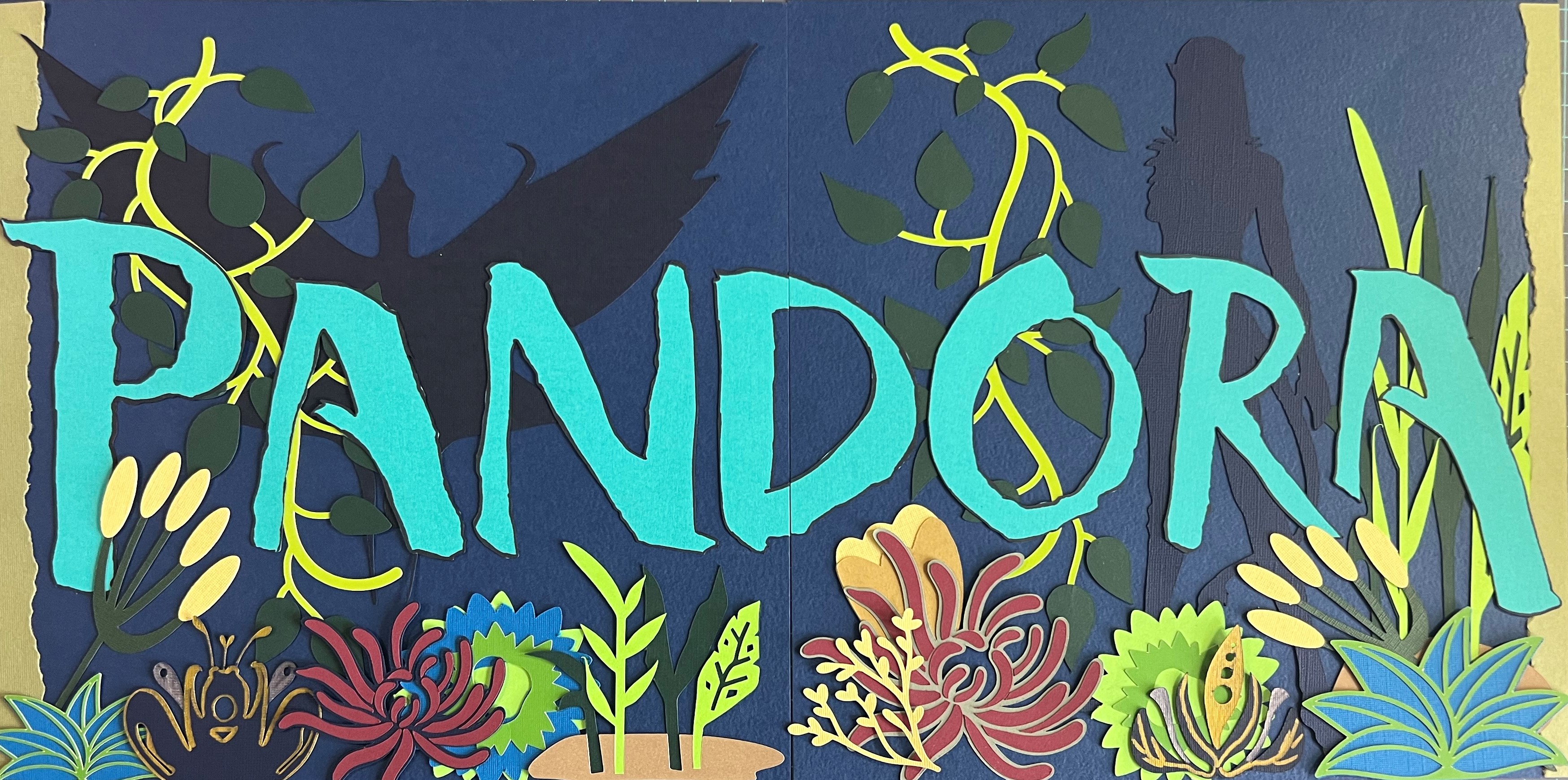 The Na’vi and Ikran (Dragon) silhouettes were part of the Etsy purchase and were also cut using my Cricut Machine. All of the plants were predesigned plan options on Cricut Design Space, which I stretched, or used Pandora color schemes when cutting. Some of the plans have been outlined with gold markers to add to the design. While we were at the park, I took closeup pictures of the “plants” so that I could know how to create some of the plants that you see here. The borders to this page were created using a jagged edge tearing tool.