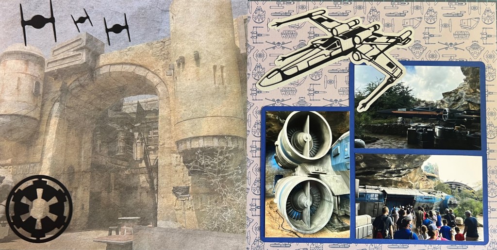 The photographic Galaxy’s Edge themed scrapbook paper on the left-side I purchased at Scrap Your Trip. I used my Cricut machine to cut out the other graphics on this page, as well as the X-Wing fighter that is on the right-hand page. This was a pretty delicate cut and I had to be very careful when putting it together. I found these SVG images on Etsy as part of a Star Wars bundle.