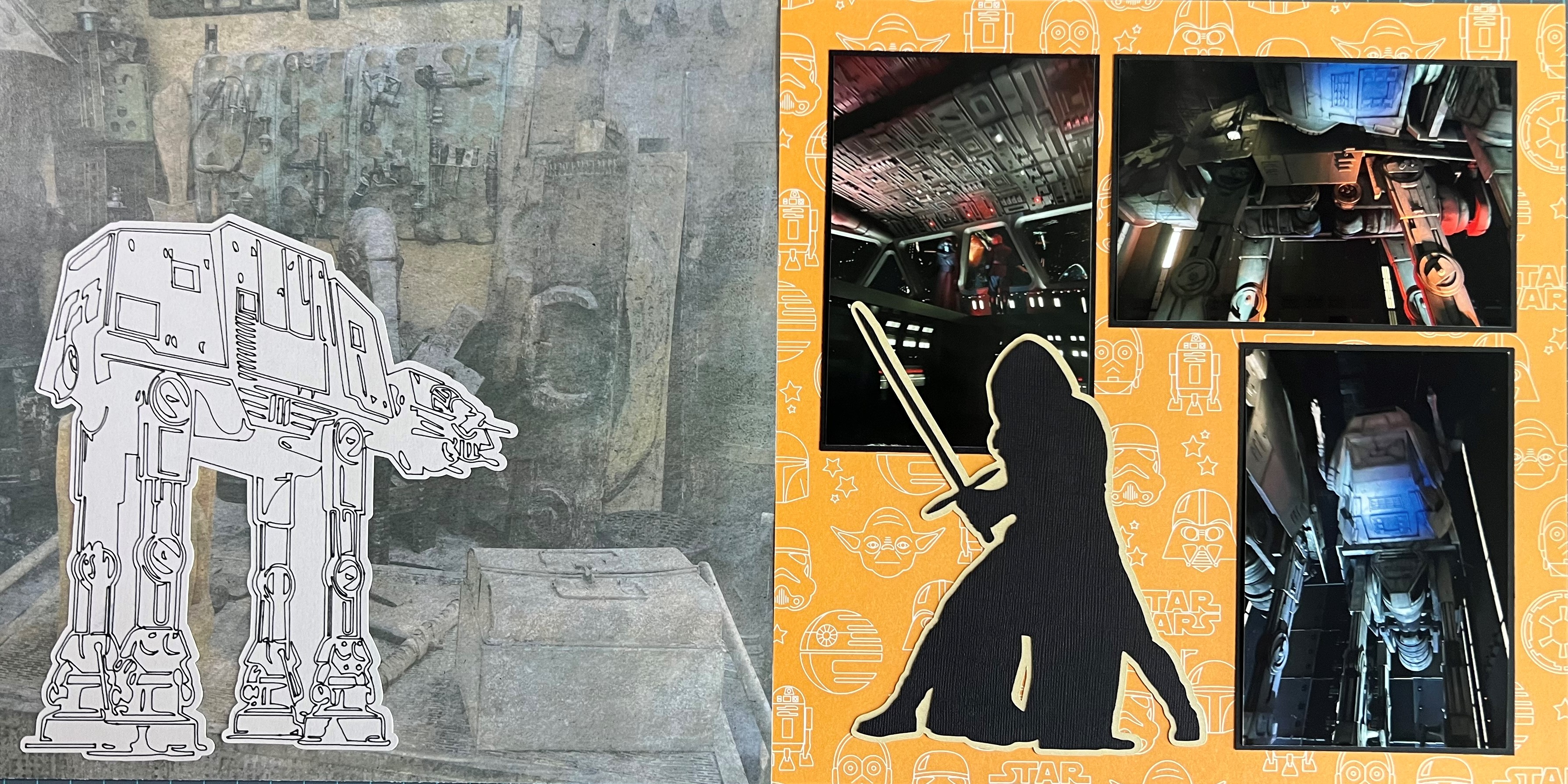 The photographic Galaxy’s Edge themed scrapbook paper on the left-side I purchased at Scrap Your Trip. The background paper on the right side came from a Star Wars cardstock pack that I found on Amazon, and I bordered the photos in black to help them stand out against the busy background paper.