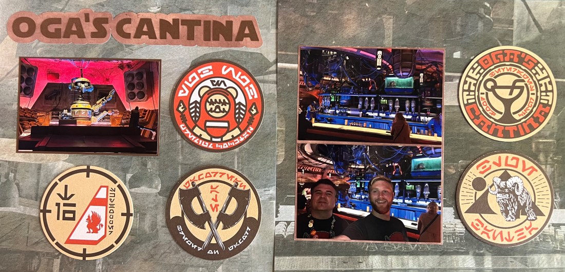 The photographic Galaxy’s Edge themed scrapbook paper used in this spread was purchased at Scrap Your Trip and are of the eating establishments in Galaxy’s Edge.
