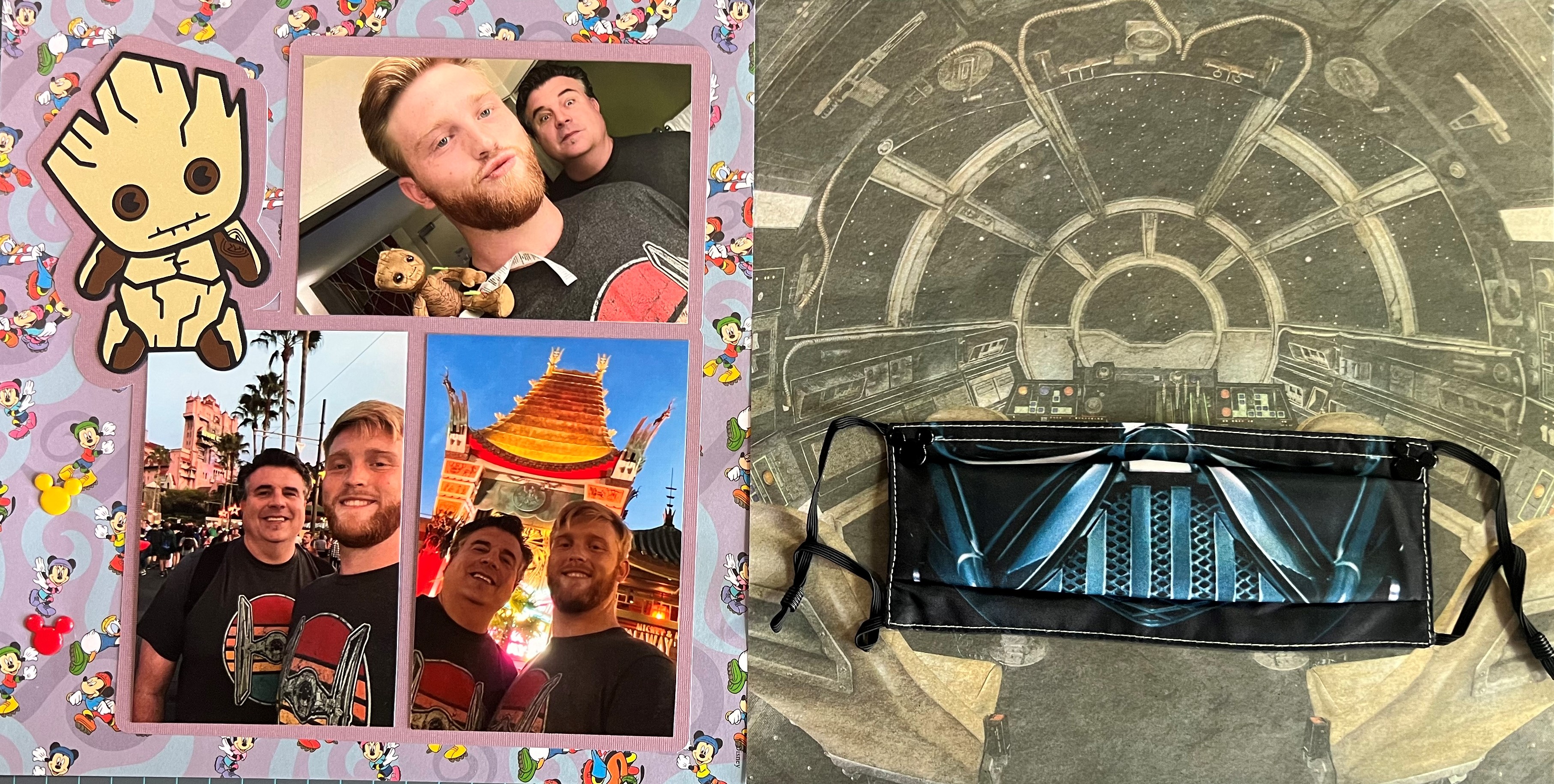 The photographic Galaxy’s Edge themed scrapbook paper used in the right-hand side was purchased at Scrap Your Trip and is of the inside of Smuggler’s Run attraction inside of the Millenium Falcon. I attached my Darth Vader Covid face mask, which was required inside at Disney at the time, using Mickey Mouse brads. I did not think that I would use this particular mask anywhere else again, and I thought that it would be a neat piece of ephemera for this scrapbook that would help to show what we were engaging with at the time.