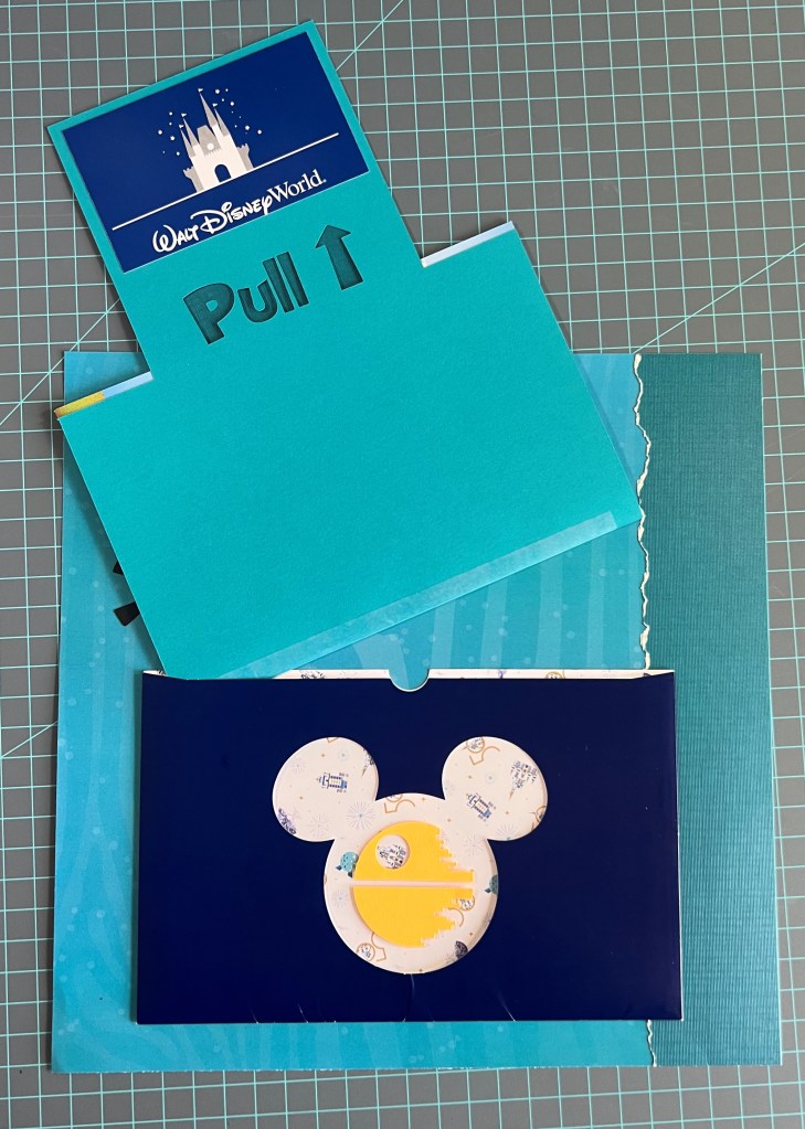 The dark blue envelope was from our Welcome Packet that we received in the mail after booking our vacation. The Gold Mickey Mouse stick that is on the Front Title page of the album could be seen through the plastic transparent Mickey Mouse shaped window. I attached left over cut out of the death star from one of the earlier pages onto the outside of plastic sheet.