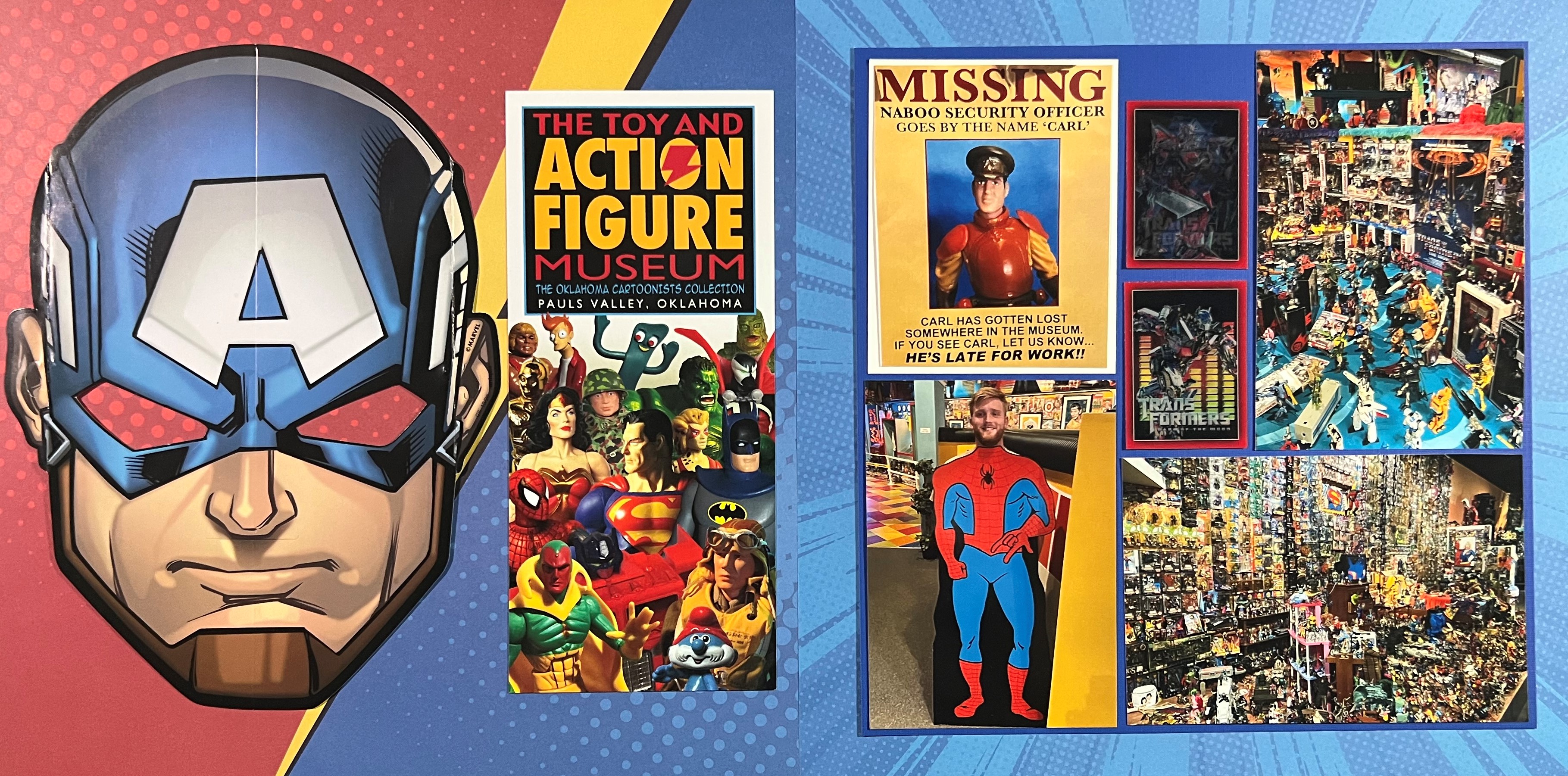 During my son’s visit for Christmas one of the day trips that we took was to the Toy and Action Figure Museum in Pauls Valley, OK. This is a fun location for all ages. Children will love it, and those of us who are older will enjoy the nostalgia. As you can see from the pictures the collection numbers in the thousands of items. The picture of the “missing poster of Carl” is a clever way that the museum helps people to look closely at the exhibits trying to find Carl. It took us quite a while to find him, but we eventually did, and you will see him in the third spread of this location.
