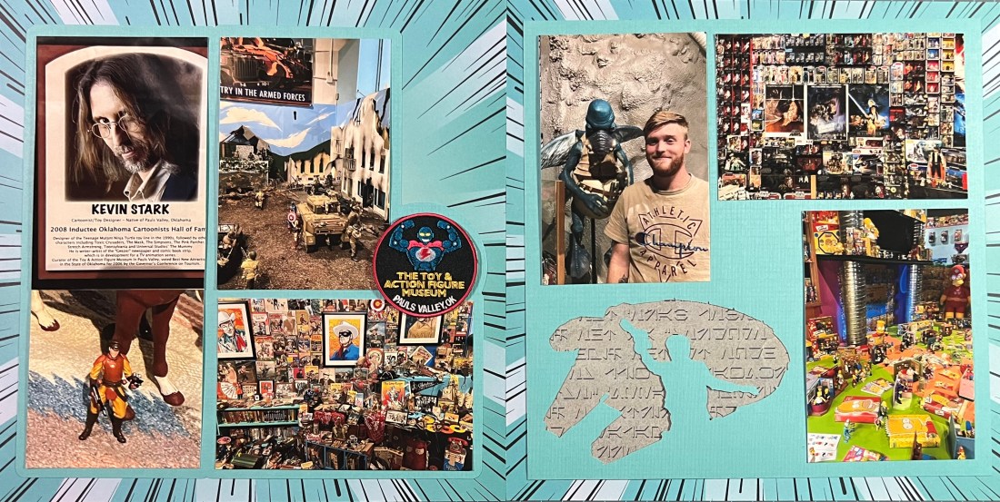 The background paper for this spread came from a superhero paper pack that I purchased on Amazon. For both pages I used Cricut Design Space to create a custom shaped mat which I cut out on my Cricut machine. The left page mat has a semi-circle to accommodate the patch from the museum gift shop, and the right-side mat includes a cutout of the Millenium Falcon and Hans Solo to bring attention to the Star Wars collection in two of the pictures. This cutout has a Star Wars paper behind it to reinforce the theme, and it matches the colors of the photo above it. The bottom right picture is of the Simpsons collection, and on the bottom left you can see that we found Carl! He was lost in the Western section next a horse action figure.