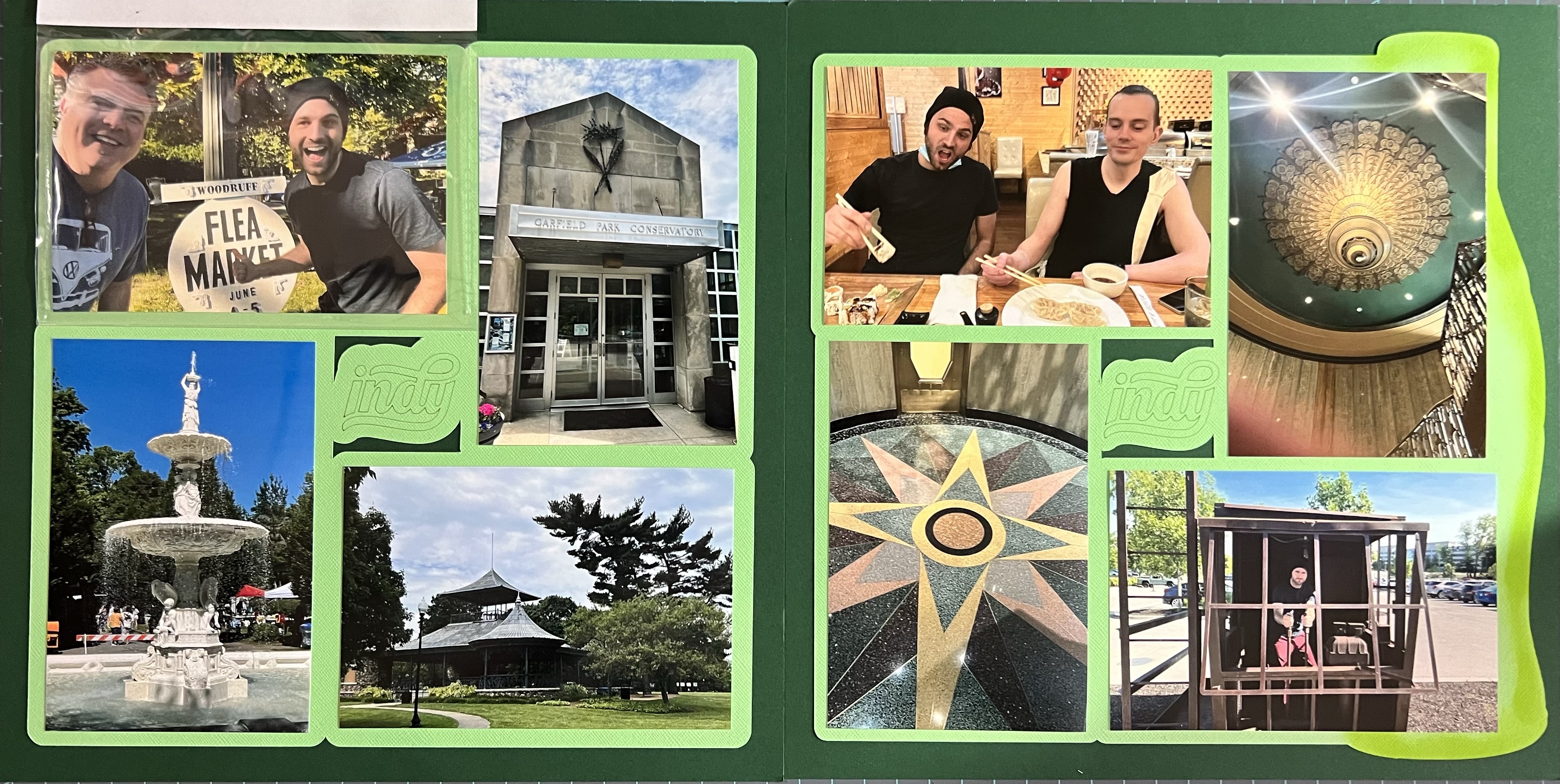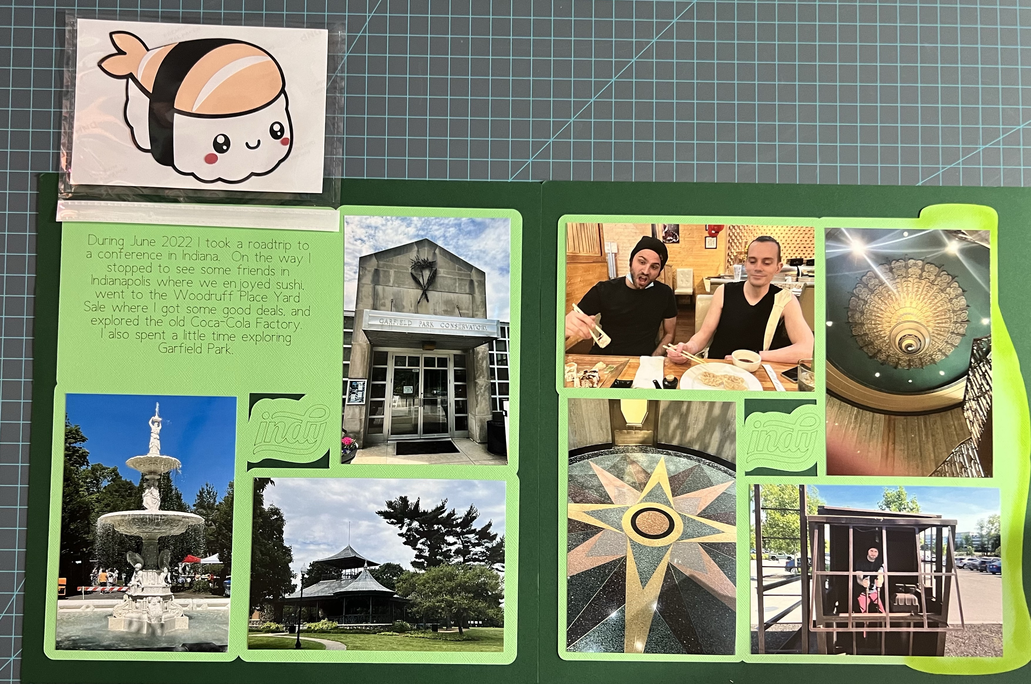 In June 2022 I went to a conference back at my old institution in Indiana and made a road trip out of it to see some friends. This spread shares pictures from two days that we spent together all over Indianapolis. We went to the Woodruff Place Yard Sale, All you can eat Sushi and the old Coca-Cola distribution complex which has now been turned into a hotel and family entertainment area called the Bottleworks District. We stayed at a hotel called the Ironworks Hotel and had some fun playing in the kids industrial play area. I also spent a little time on my own in Garfield Park.