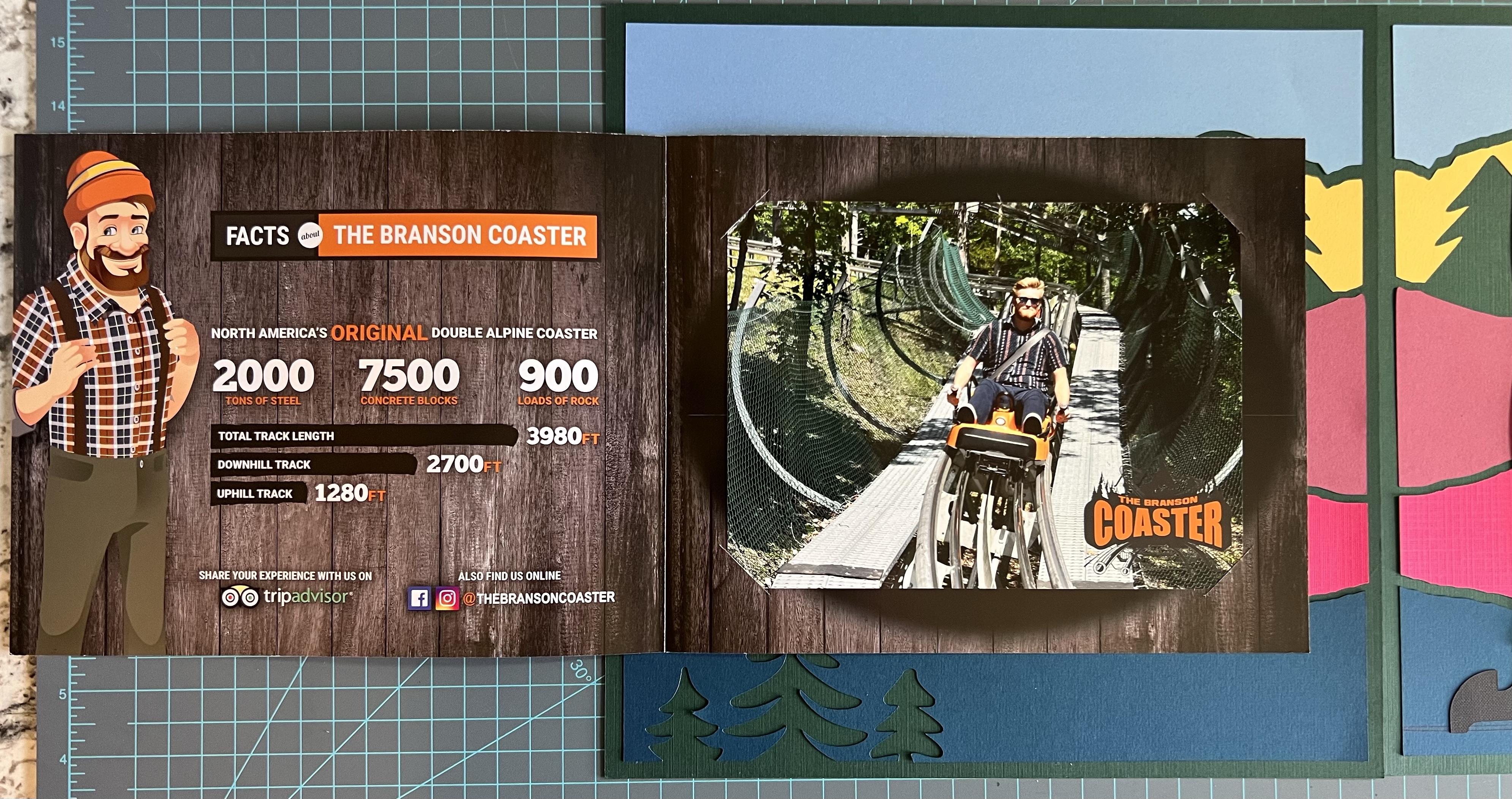At the end of the ride, I decided to buy the event photo for all three of us which were fairly big and all came in a cool folder. I knew that it would be hard to get all of the pictures onto one spread, so I actually made 4 pages for this adventure, that are all themed alike. I used Cricut Design Space and my Cricut machine to create the mountain background, draw a track onto the segments, and to cut out the small black coaster. I mirrored the image so that it would look good where the pages connect in the middle.