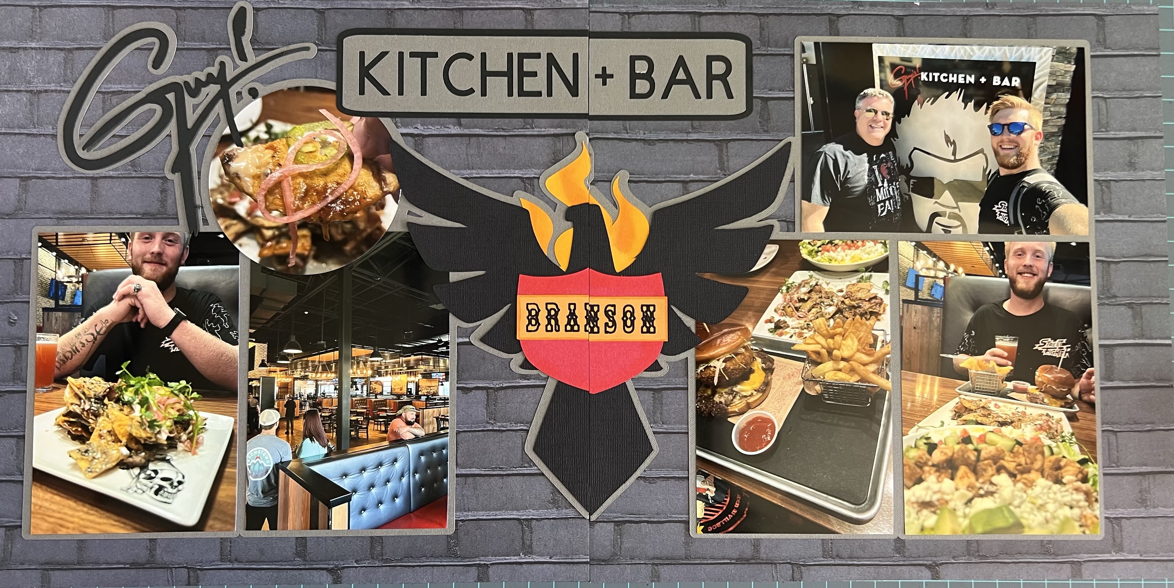 The theme for this spread is based on the picture of the two of us in the upper right-hand corner with the restaurant sign. You can see brickwork on the wall which lead to the brick background paper, and then I used black and grey to match the colors from the sign. In the middle of the spread is my interpretation of the restaurant logo. I designed this logo (and the matting) on Cricut Design Space, and then cut out using my Cricut machine. I used inking on the edges of the flames and the shield. The yellow “Branson” title was created using the pen feature of the Cricut machine, and then I outlined it with an orange sharpie to help give it some definition.