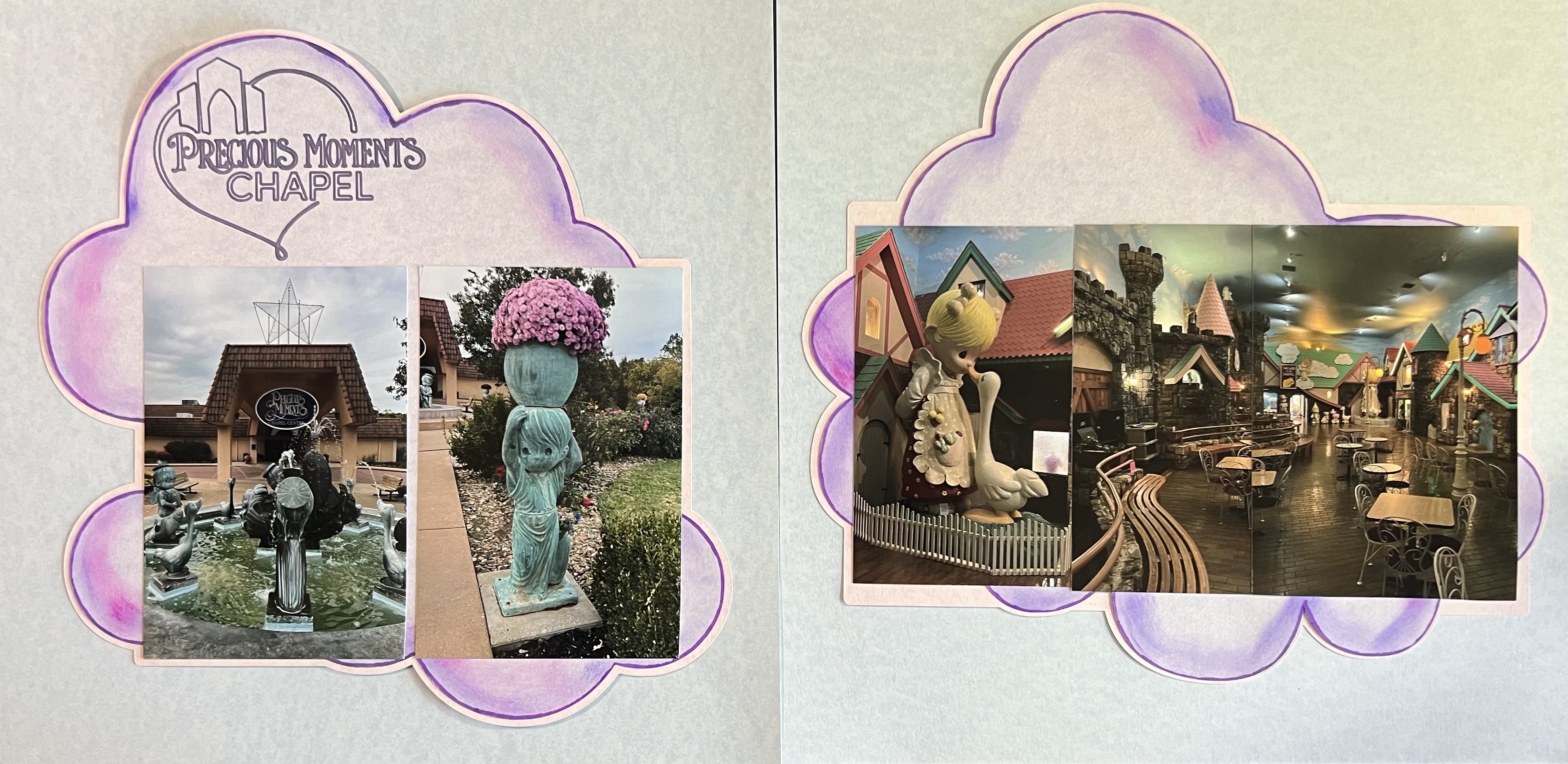 This is the first spread of two that I made to commemorate this visit and I chose to keep the pages simple in order to draw the eye of the viewer into the details in the pictures. I designed the layout using Cricut Design Space and then cut out all of the pieces using my Cricut Machine. The Precious Moments Chapel logo I was able to find online and import into Cricut Design Space and I used the draw feature to draw that onto the cloud.