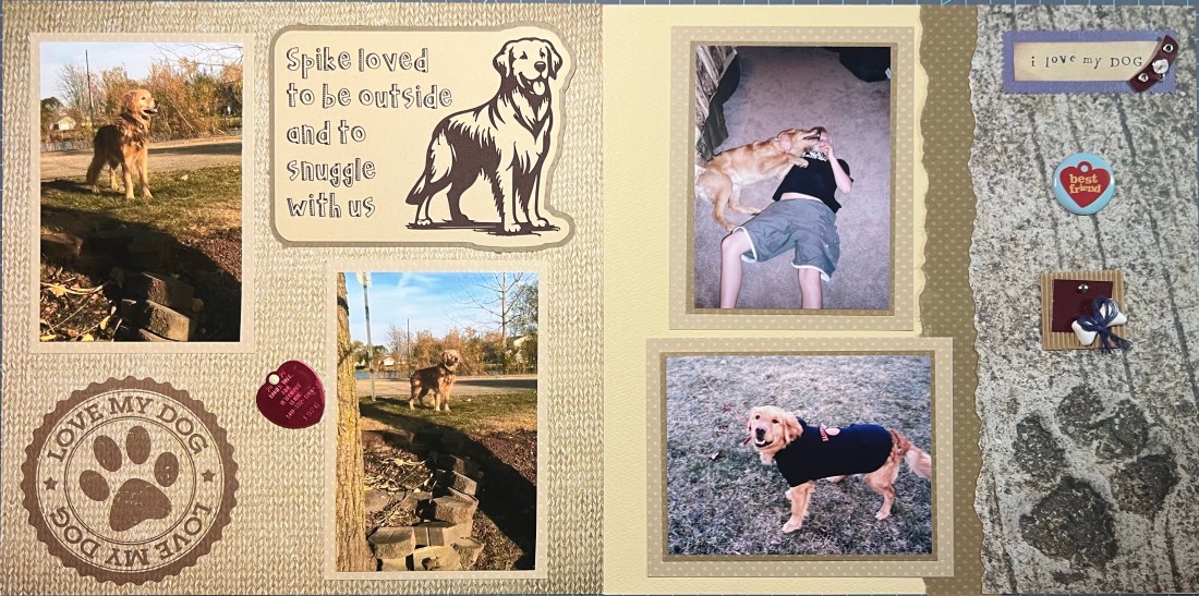I designed the Title Block on this spread using Cricut Design Space and then drawing and cutting it out using my Cricut Maker. I purchased the Golden Retriever image on Etsy and then flipped it so that he was looking to the right. In Cricut Design Space I use the “Offset” feature to create the double border around the image.