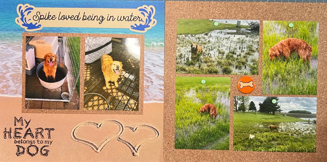 This scrapbook spread in his memorial album celebrates Spike’s love of water. I chose the beach background paper from the Dog paper pack, and then selected a cork photo background paper to match.