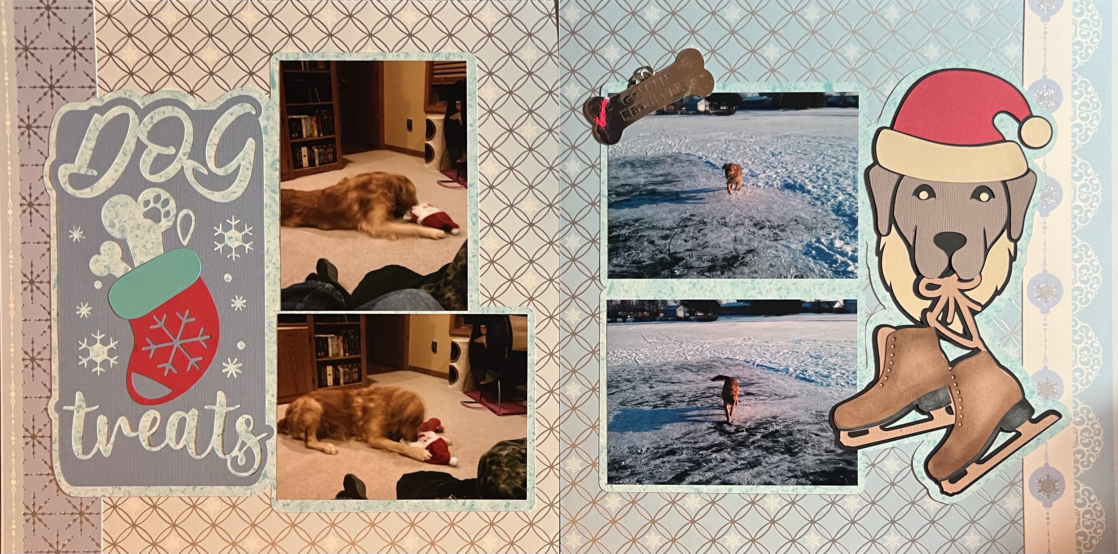 This is the third spread in Spike’s Memorial Album, sharing memories of Christmases past – enjoying the Christmas stocking dog treats, and trying to ice skate with us on our frozen pond in Indiana.