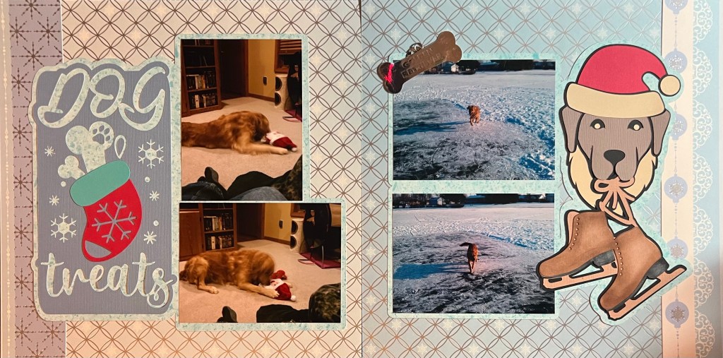 The right-hand page has pictures of Spike running on our frozen pond while we were trying to ice skate – he really enjoyed that, but his feet got pretty cold so we could not let him do it for very long. I combined two Cricut images – the golden retriever and the ice skates to make the image on the right. I used ink to give the ice skates some dimension and I am pretty happy with the way that they turned out.