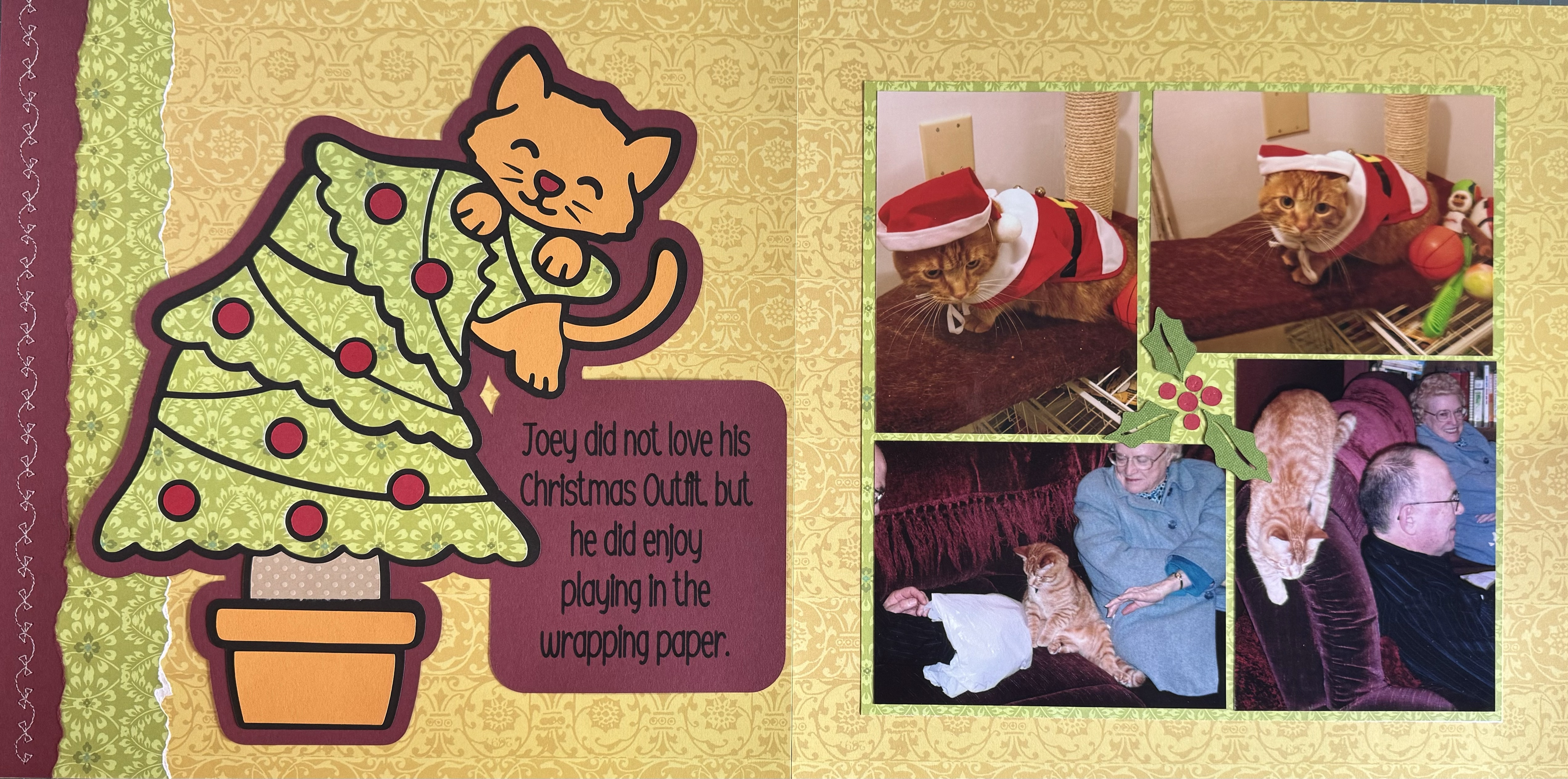 This spread from Joey’s memorial album shares some pictures from Christmas time at our house. The top two photos are of Joey in his Christmas outfit, which I don’t think that he was too happy about and didn’t last too long on him. The bottom two pictures are of Joey playing with my dad and aunt at Christmas time.