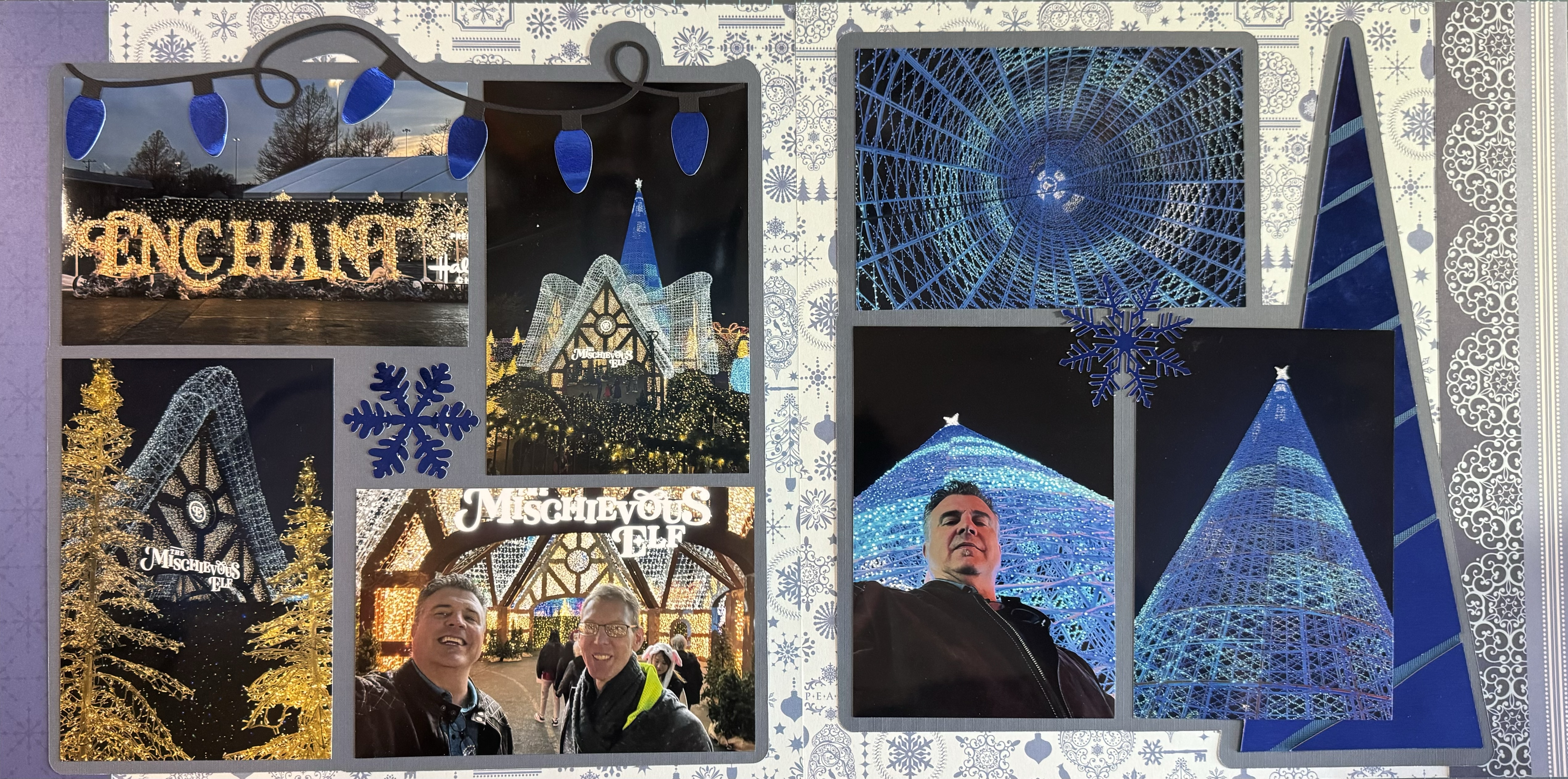 Since there was so much blue in the photos on this spread, I decided that the color theme should be blue. A Blue Christmas usually means something bad, but in this case, it means joy and wonder. I designed the spread using Cricut Design Space, and then cut out the pieces using my Cricut Maker. I coordinated the colors of the Christmas lightbulbs with the snowflakes and the Christmas tree graphic on the right-hand side, using a blue foil cardstock to create some shine on the page in honor of all of the lights in the pictures.