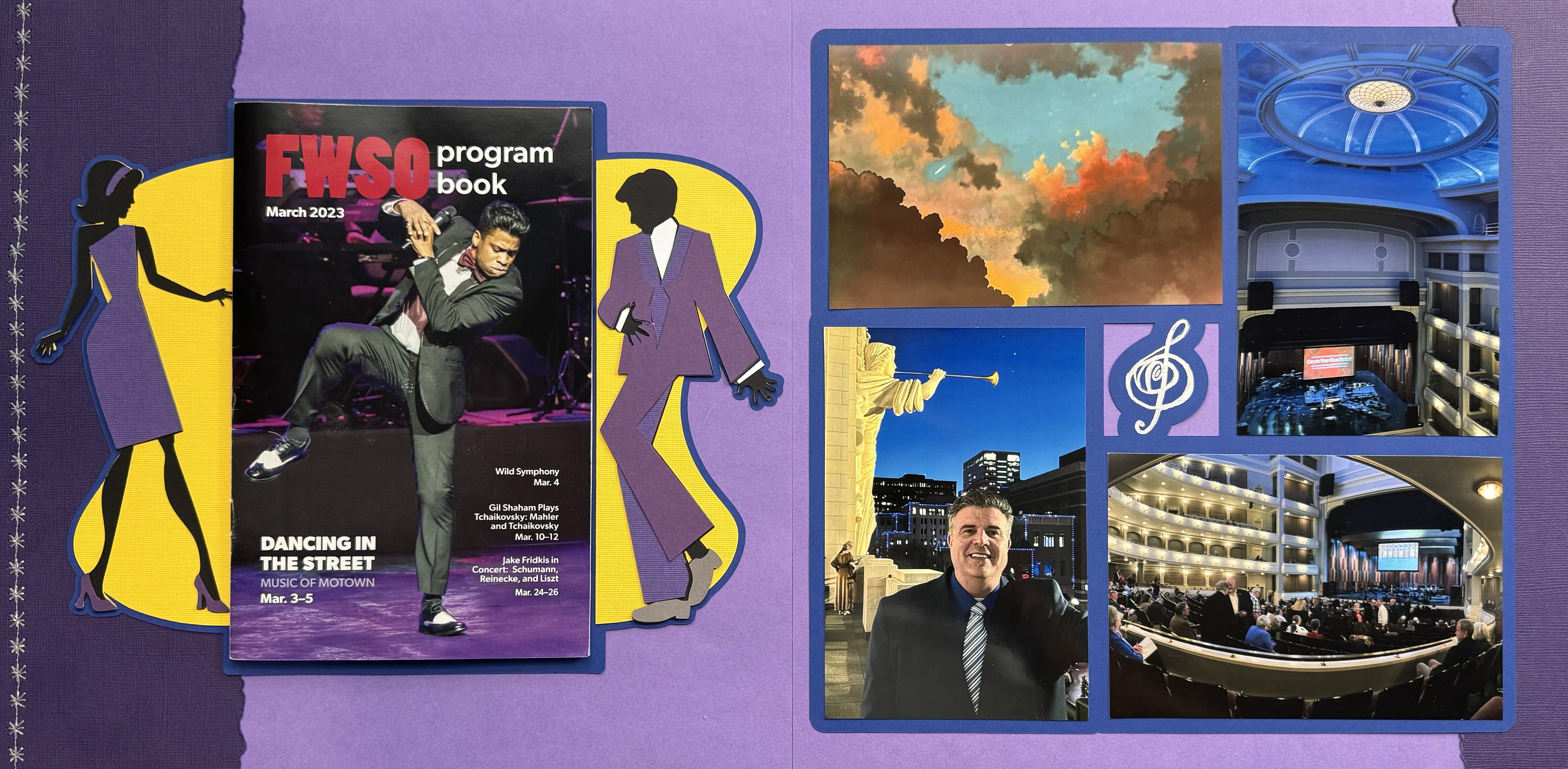 This spread shares the experience of “Dancing in the Street: Music of Motown” at the Fort Worth Symphony Orchestra, in March 2023. The color scheme for this spread was chosen based on the color of the program and the blue lighting in the picture of the symphony hall.