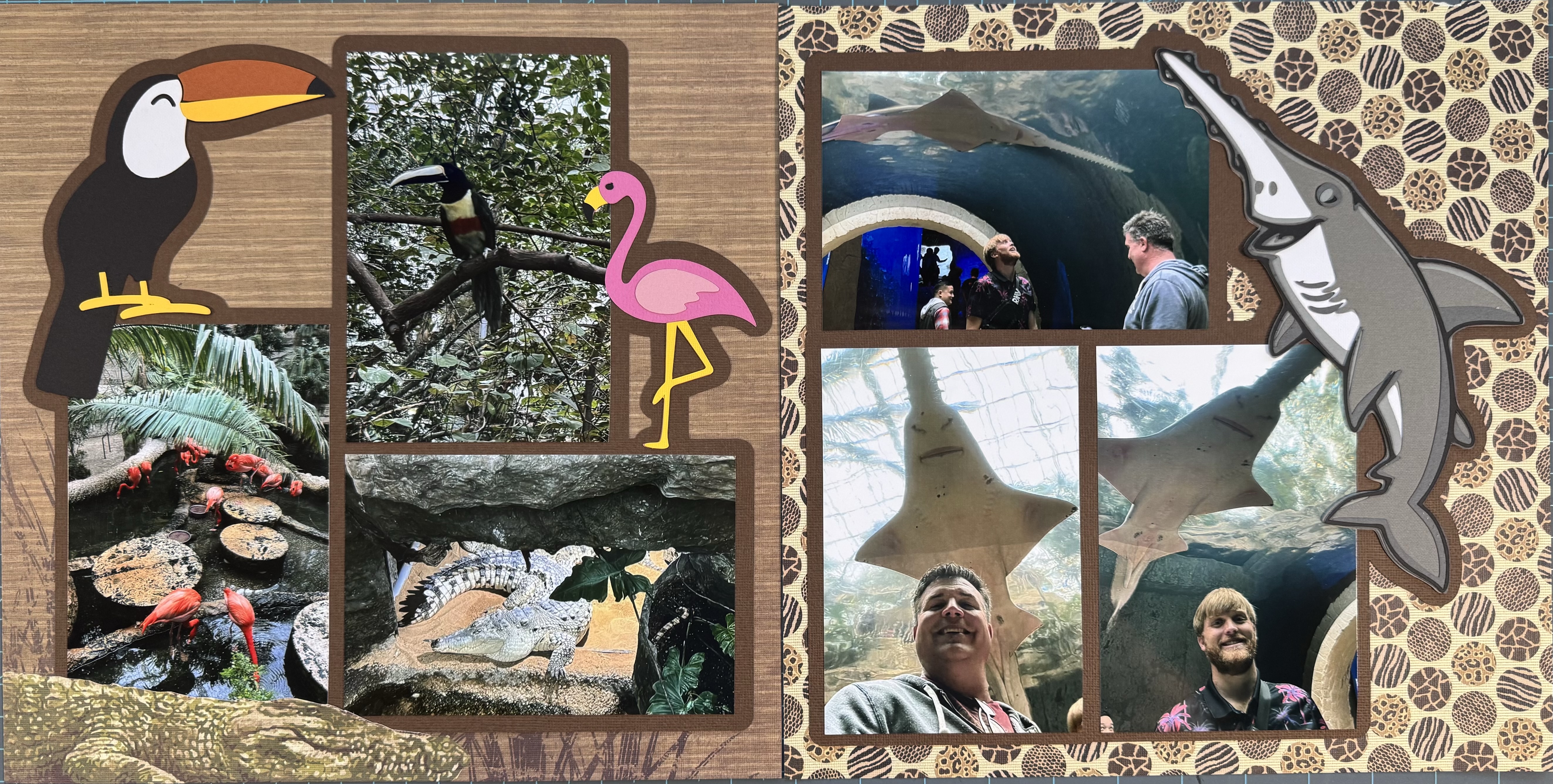I was able to find an SVG of the sawtooth fish online and then used Cricut Design Space and it’s new upload and layer feature to create the six layer sawtooth fish on the right-hand side. This took a lot of work – but I really enjoy how it turned out. The toucan and the flamingo are part of the Cricut Access collection. I used Cricut Design Space to design this entire layout, including the matting (using the Outline feature), and then cut out all of the pieces using my Cricut Maker. It took about two hours to create all of the pieces for this spread, but I really like how this turned out and am glad that I put in this effort.