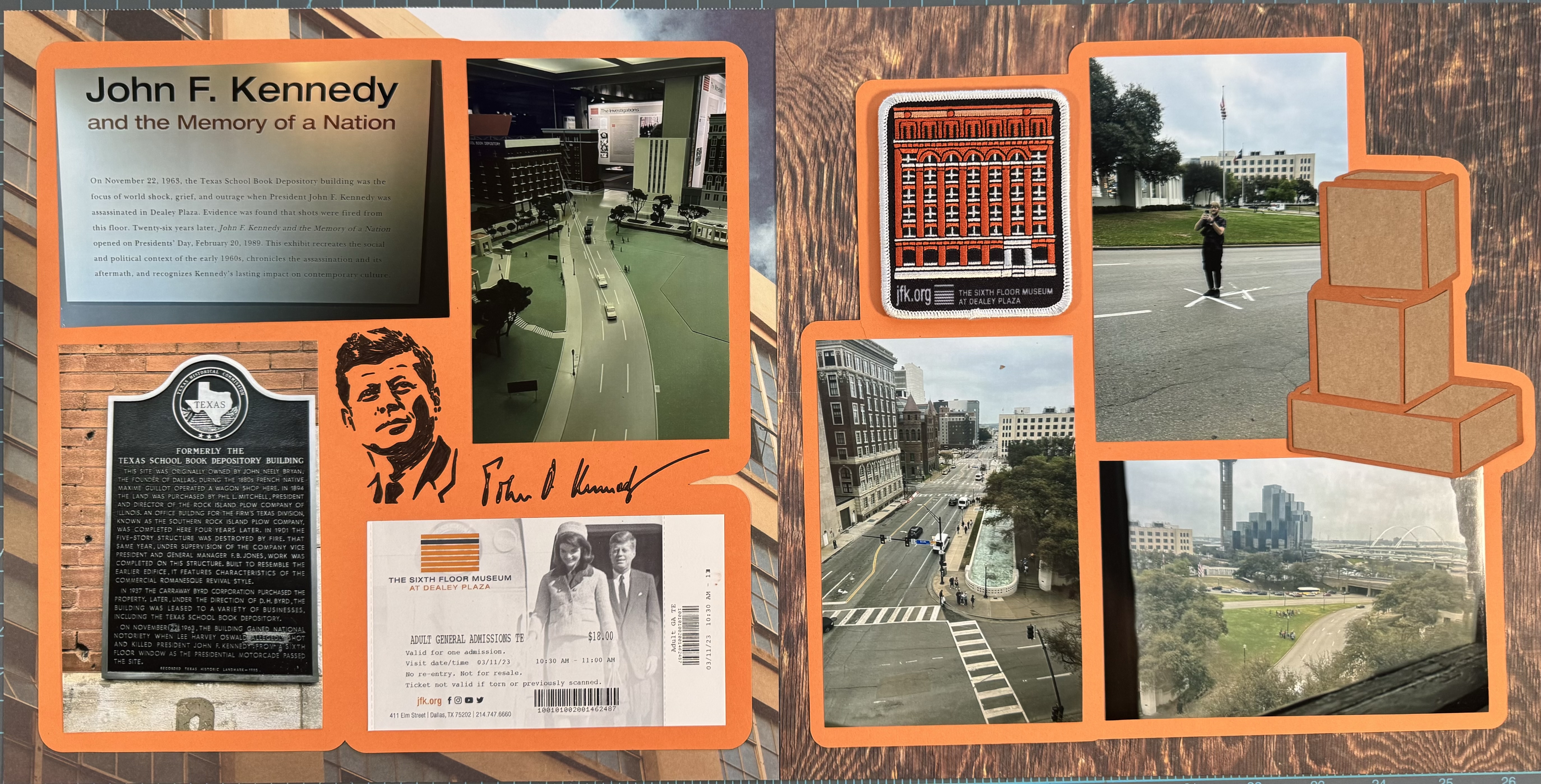 I chose an orange theme for this spread as orange is highlighted in the logo of The Sixth Floor museum and is present on the entry ticket and the museum patch, both of which are on this spread. The background paper is an industrial building and a wooden floor to highlight the features of the Texas School Book Depository.