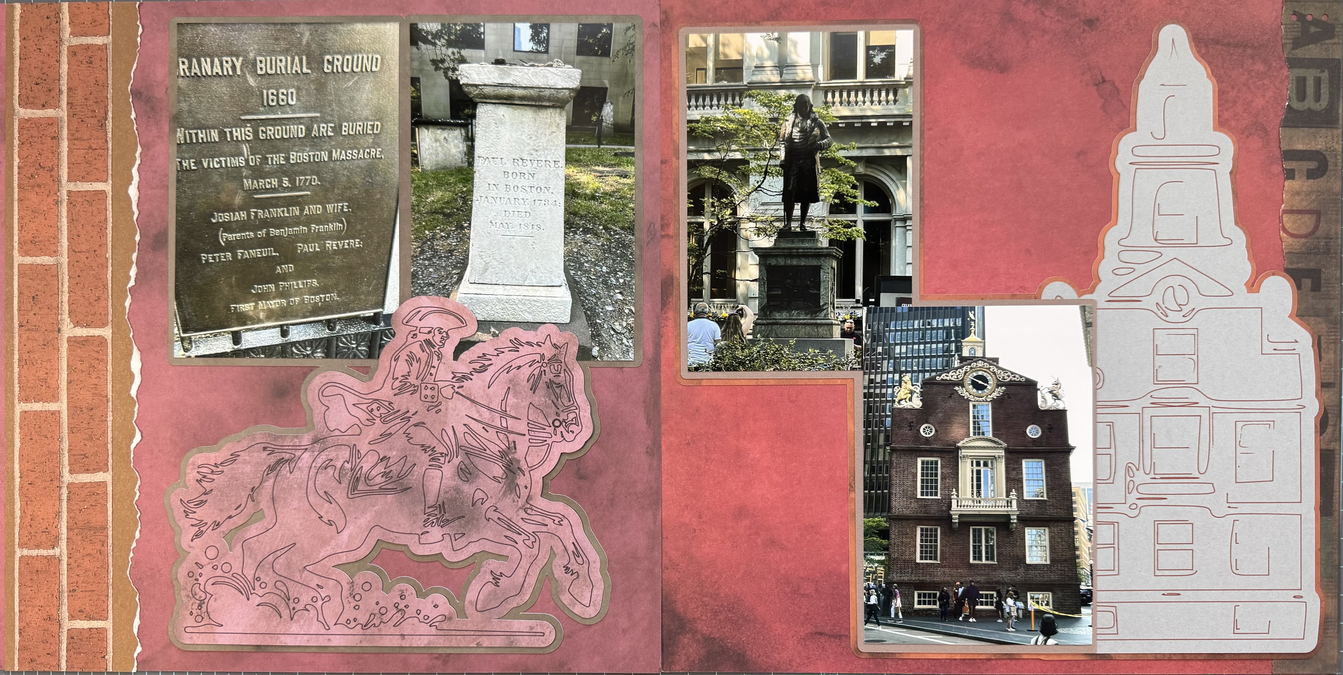 For this spread, I chose red and brown themes to match the colors of the Old State House. The images of Paul Revere and the Old State House were sourced online, imported into Cricut Design Space, and drawn with a pen using my Cricut Maker. To tie this spread to the Freedom Trail, I included a double row of bricks along the left-hand border, symbolizing that these two locations are part of this historic pathway, and tying them to the other Freedom Trail spreads in this album.
