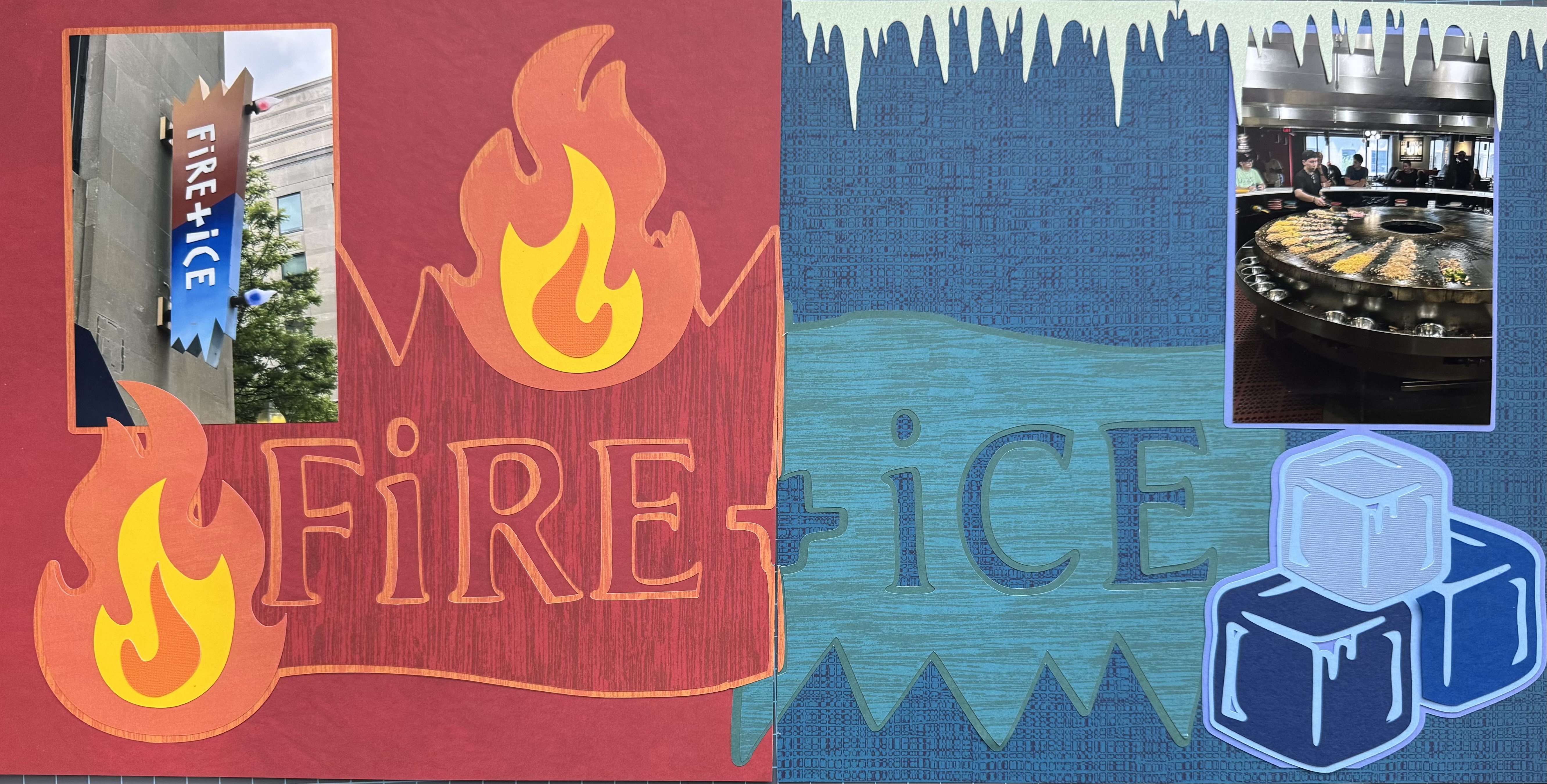 This spread is a refreshing departure from the series of historical-themed pages, capturing the vibrant, modern vibe of Fire and Ice. To reflect the restaurant’s unique concept, the design divides into two distinct halves: the left-hand side symbolizes fire, while the right-hand side represents ice. The entire layout was designed in Cricut Design Space and cut using my Cricut Maker.