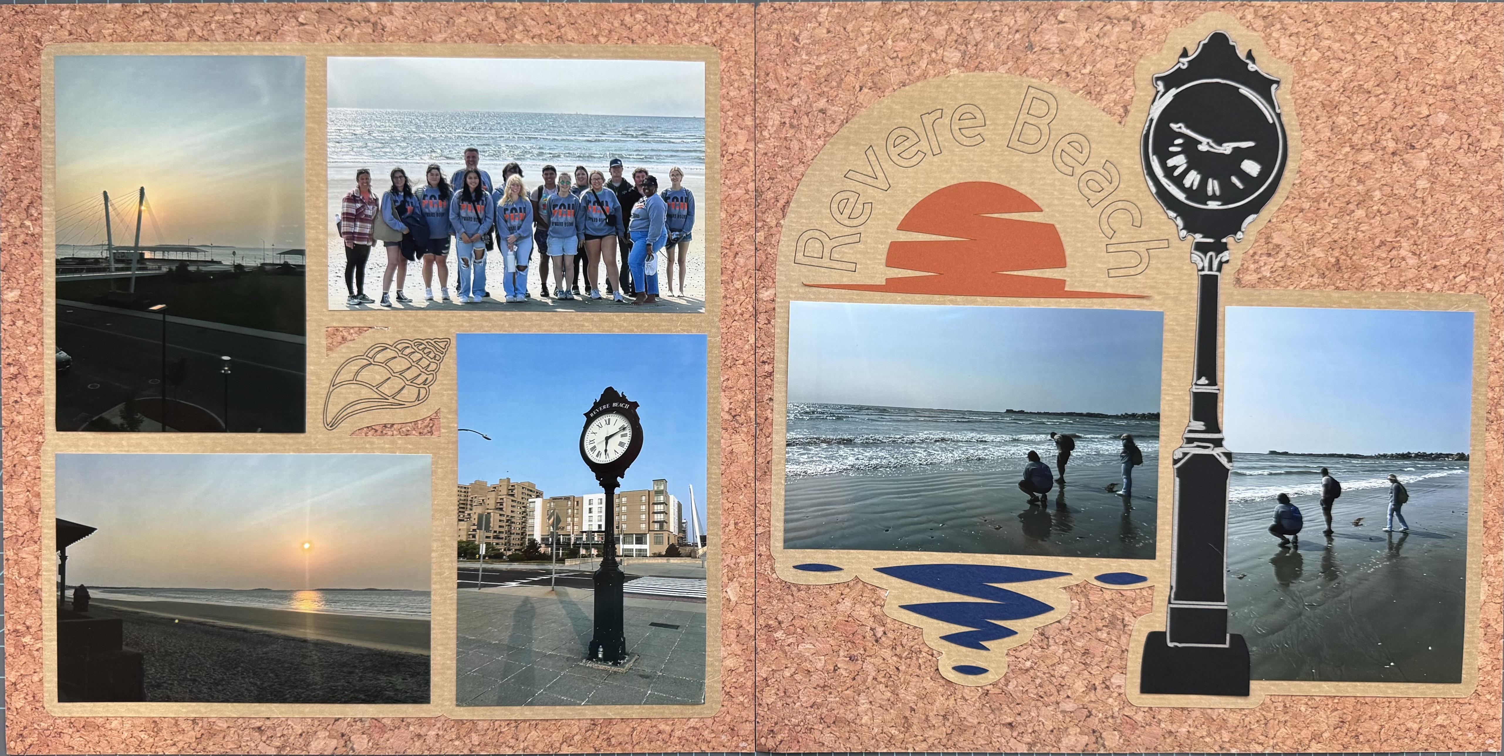 Obviously, it was important to choose a beach theme for this page; however, I could not find any sand paper. So, I decided to use photographic corkboard instead, as I felt it would mimic the look of sand, and I’m pretty pleased with how it turned out. The matting for the photos is done in a light brown to stay consistent with the theme.