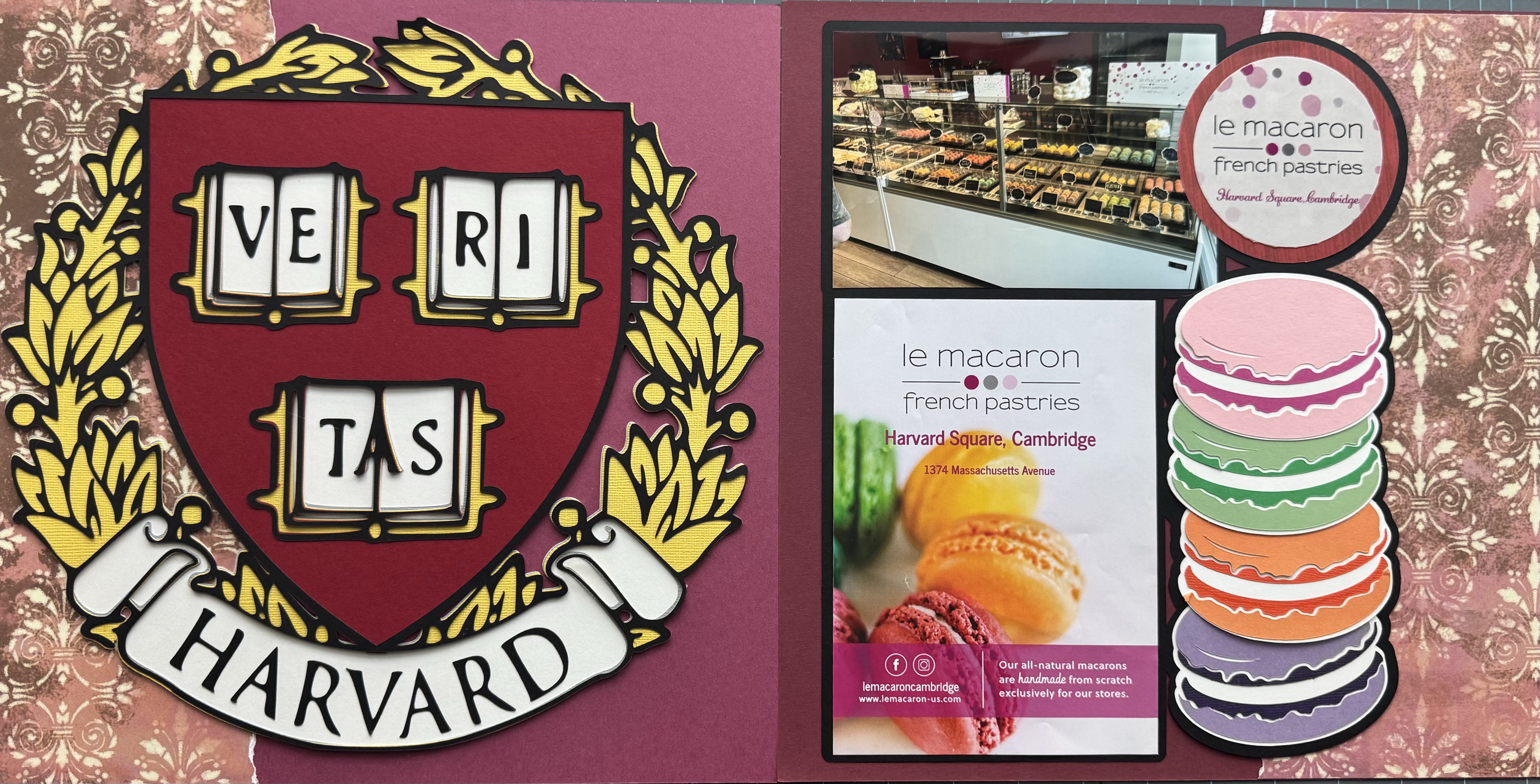 The other side of the spread highlights Le Macaron French Pastries, a charming little shop in Harvard Square just outside the campus. I couldn’t resist their wide variety of flavors and ended up ordering about eight macarons, which I eagerly enjoyed. I thought the juxtaposition of the academic Harvard theme and the fun, colorful macarons was a delightful contrast for this spread. To tie everything together, I chose a pink theme to reflect the pastries, while incorporating maroon to honor Harvard’s colors.