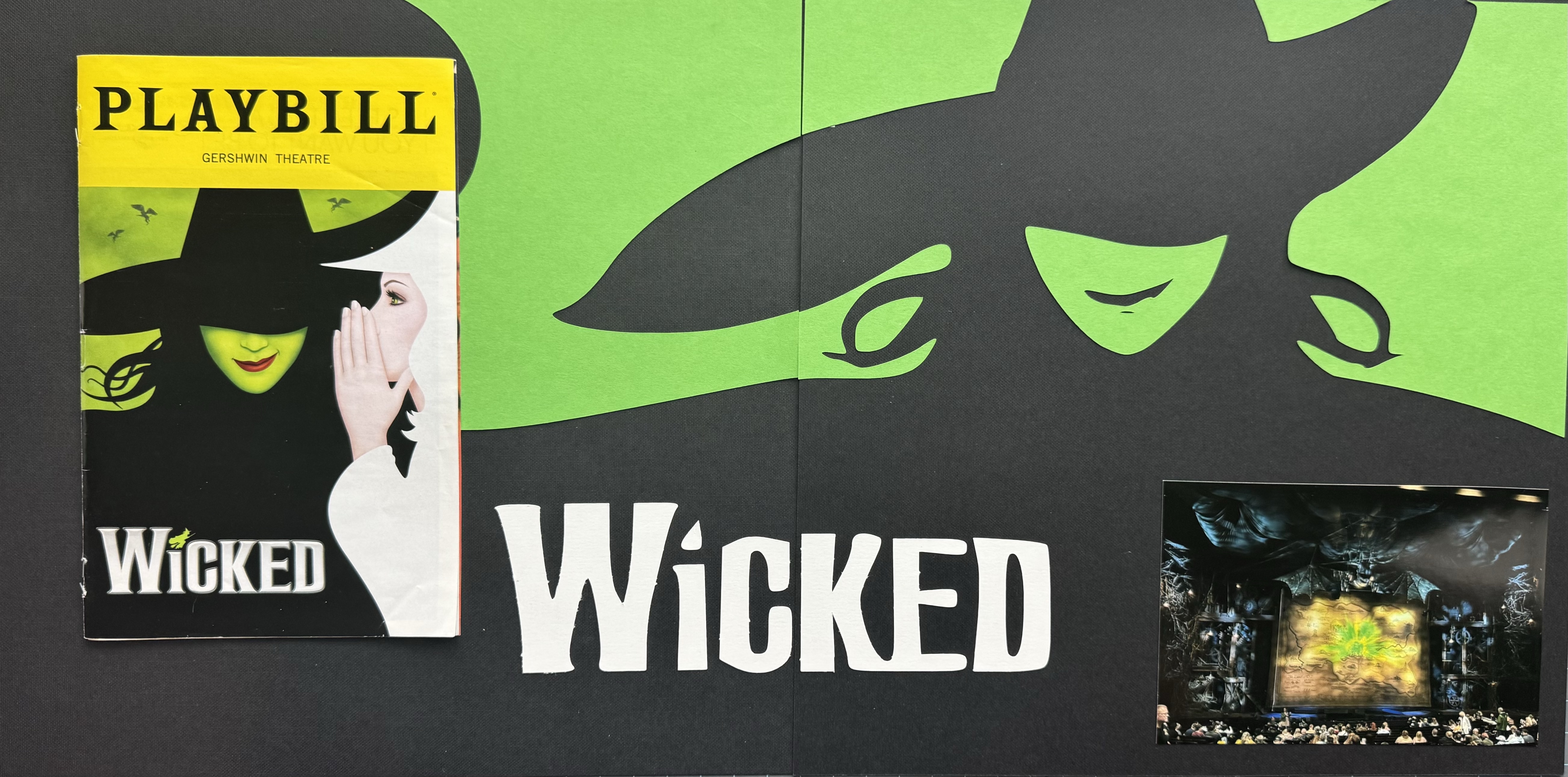 Of course, photography wasn’t allowed during the performance, so I only managed to capture one good photo of the stage before the show began. Knowing I had just this single image and the Playbill to work with, I decided to create a bold and fun layout to showcase this memorable experience. I found an image online, uploaded it to Cricut Design Space, and simplified it into the graphic you see here. I cut the design in mirror image on my Cricut Maker, layering green cardstock over a black background for a dramatic effect. To ensure the cut aligned perfectly, I carefully positioned two 12×12 green sheets on a 12×24 mat, double-checking placement before cutting. You can see the unique process I used to make sure all the elements aligned when attaching them to the background cardstock in the video linked at the bottom of this page.